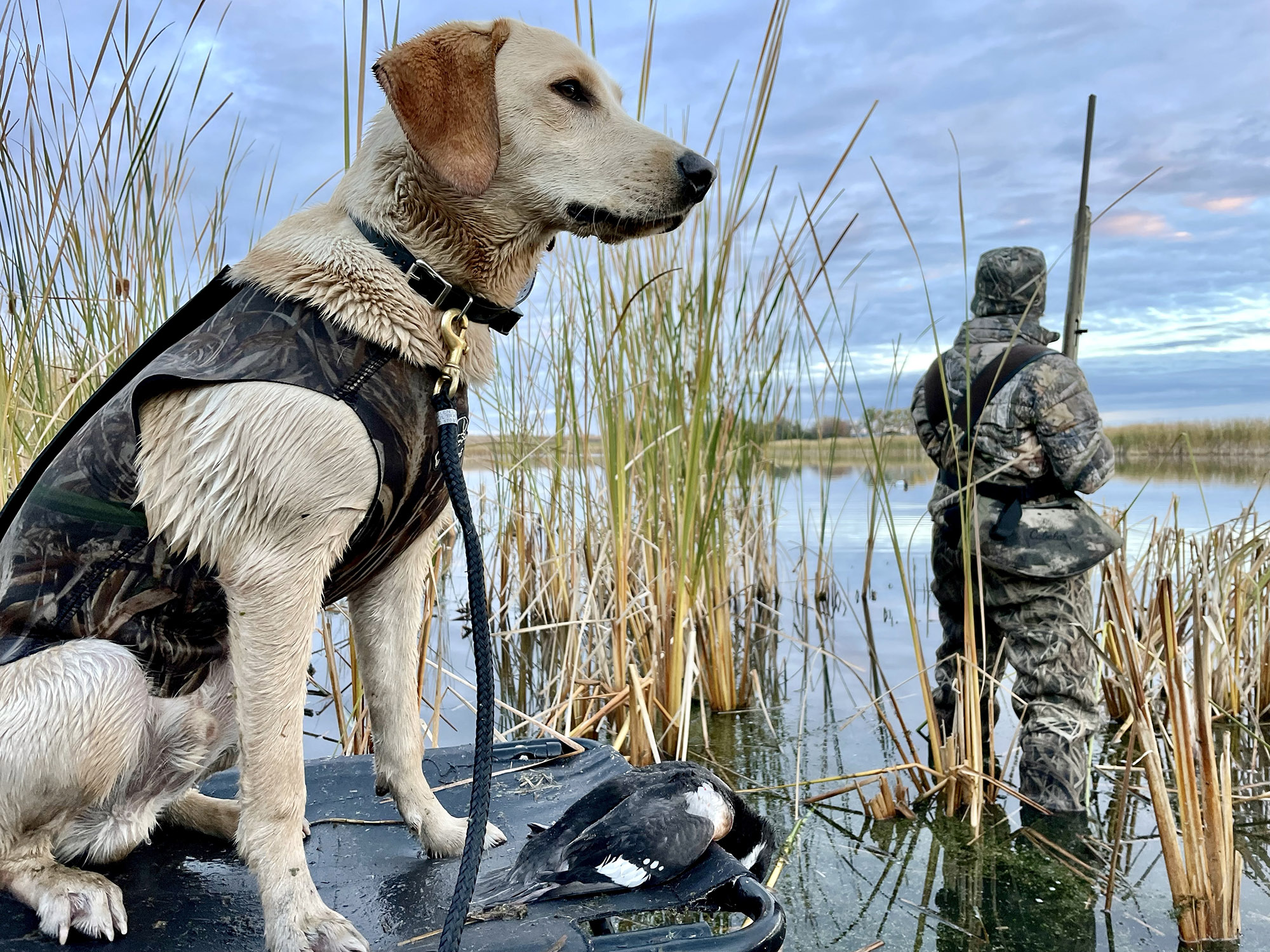Well before the hunt, explain to your guide what your goals are for your dog (lots of retrieves), and what you’re willing to sacrifice to accomplish them (shooting ducks yourself). Then ask the right questions to make sure your dog can successfully hunt the setup your guide has planned. What kind of hide is available for your pup? Will he have to kennel in a dog box or can he sit on his MOMarsh platform? Will he be able to easily see birds? Can you stand beside him? Will the guide be hunting his dog? If so, will he honor your dog and let your dog get most of the retrieves?