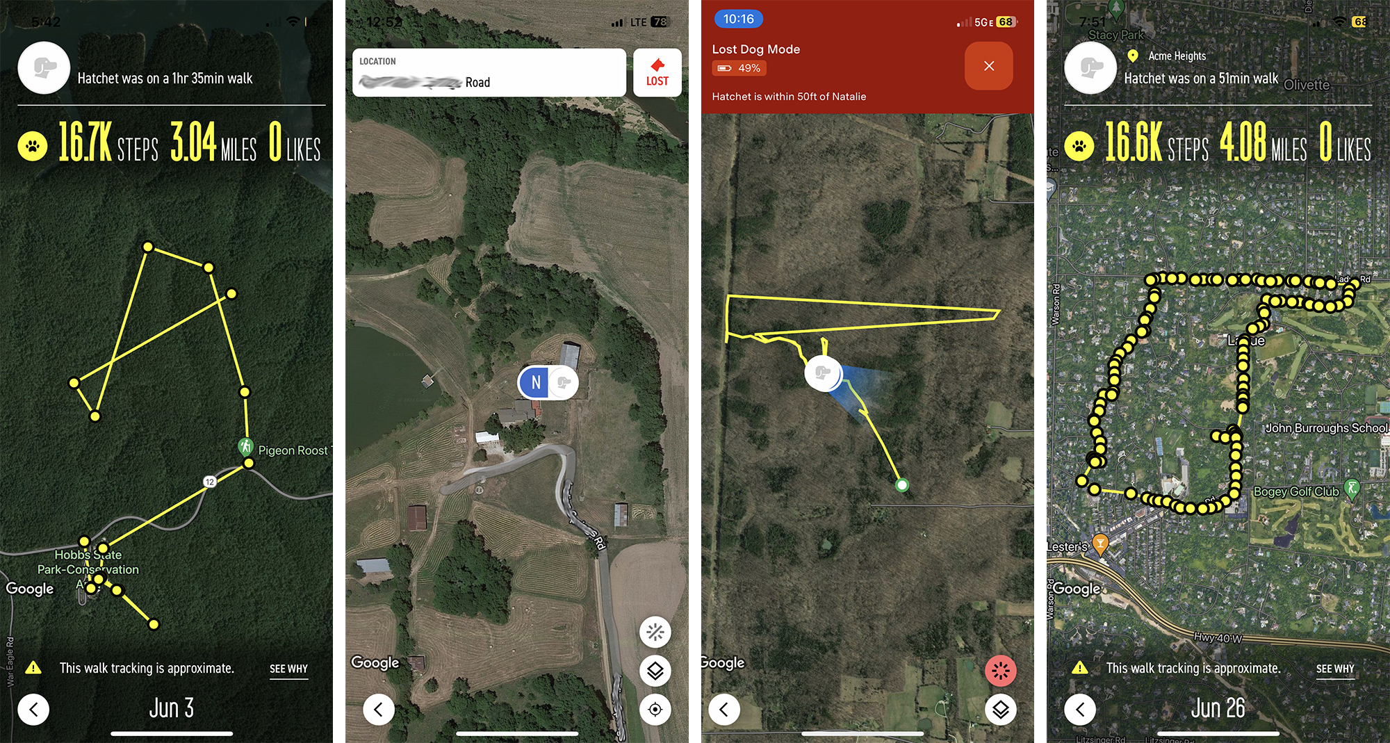 During the known-distance tests in multiple locations, Fi wasn’t super accurate. At 100 yards, Fi told me my dog was still with me; at 200 yards with lost dog mode engaged, the app told me I was standing within 50 feet of my dog. That said, when the Fi was in lost dog mode during accuracy testing in a suburban area, it almost exactly matched the Garmin TT15X track. Fi’s path of travel was less precise than Garmin’s, but it would have been plenty useful for finding my dog if he’d actually been lost.