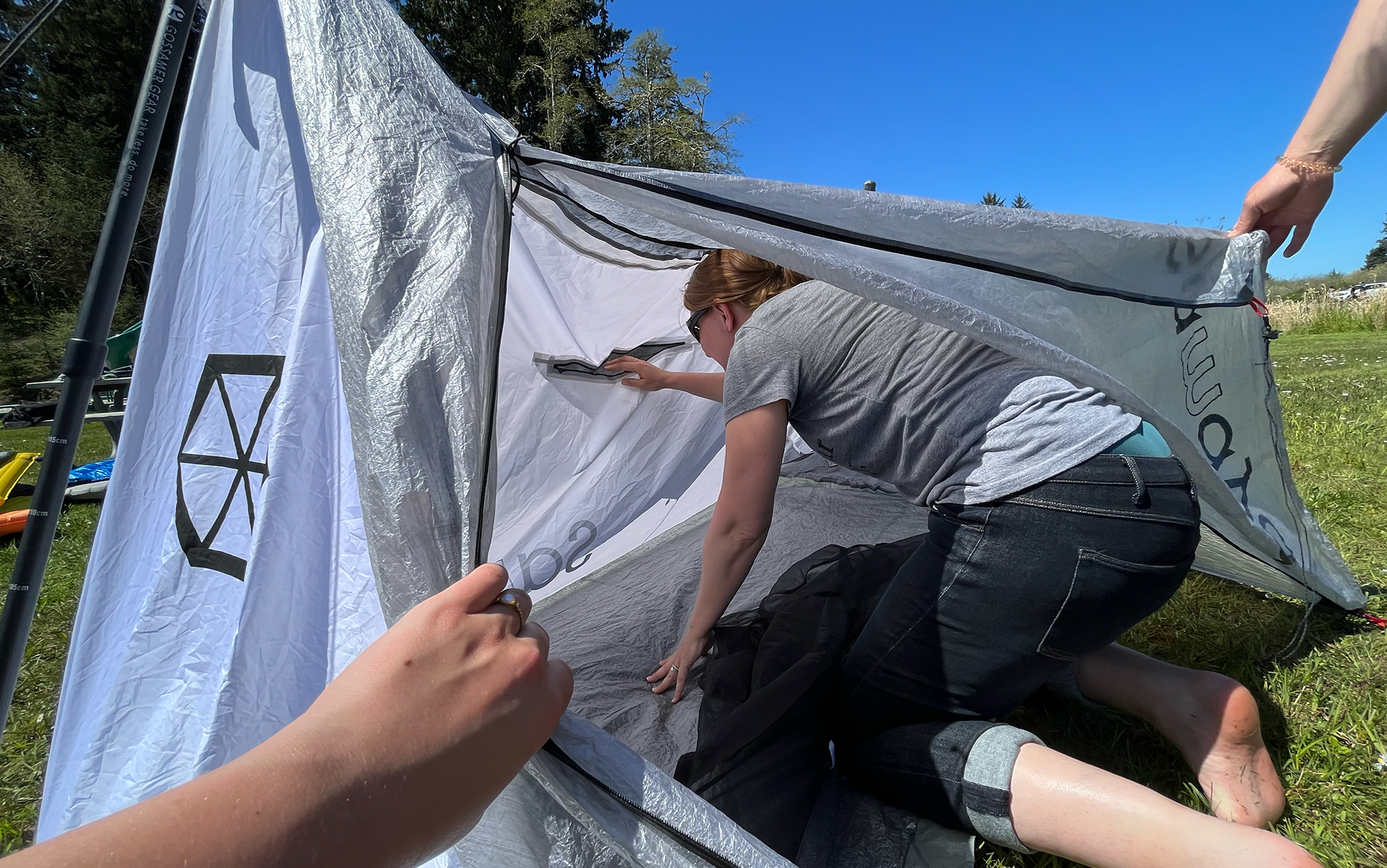 There were other problems too. The included stakes, the same as with the Radical1 that worked so well in snow, had poor hold in soft ground and bent when they hit hard ground. Adjusting the pitch of the trekking poles along the A-frame was also tricky, as pulling the guylines along the side taut tended to affect the angle and make the whole setup unstable. And while the vestibule was an impressive size, the advertised front porch option requires a second set of trekking poles — which you would only have if you were sharing this tent with another person. For us, this ultralight tent didn’t hit the mark (especially at this price point), but we’ll be watching to see what the innovative Samaya brand comes out with in the future.