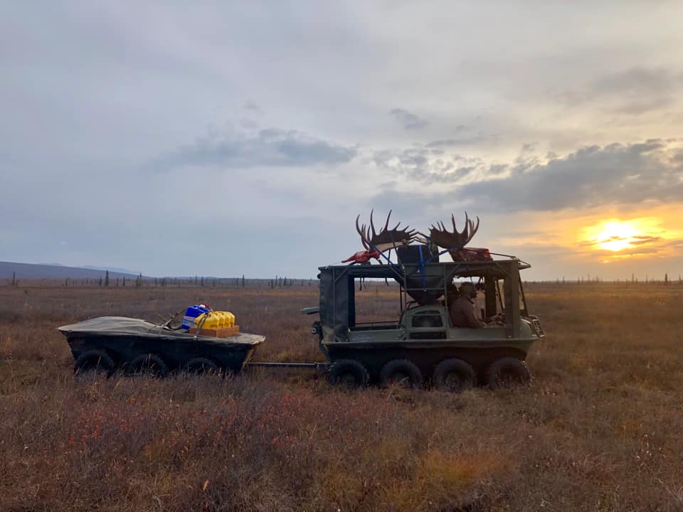 Vehicles like the Mudd-Ox and Argo are very popular among moose hunters for their ability to go almost anywhere, including water. This eight-wheel Mudd-Ox XL with a winch-powered crane, towing a six-wheel meat trailer is probably about as good as it gets for a low ground-pressure rig, and can tackle just about any bog imaginable.