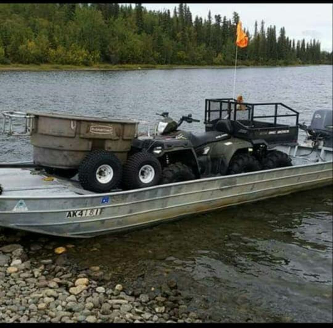 River moose hunters have varying needs, and sometimes the ideal boat requires a minimal approach to serve its purpose. This boat, built by Greatland Welding is 20 feet long, but is a whopping 6 feet wide. What looks like a plain boat is built for hauling freight and equipment. Rather than taking up space with a steering console or cab, the owner went with a 65-horsepower jet with tiller steering. This allows him to haul his 6 wheeler, meat trailer, gear, and an entire moose. This would be a chore for many 20-foot boats, but at 6 feet wide, and the included ribbed trim tabs, it has plenty of surface area to pop up on-step. When it’s not hauling, it has several seats that can be easily installed in the hull.