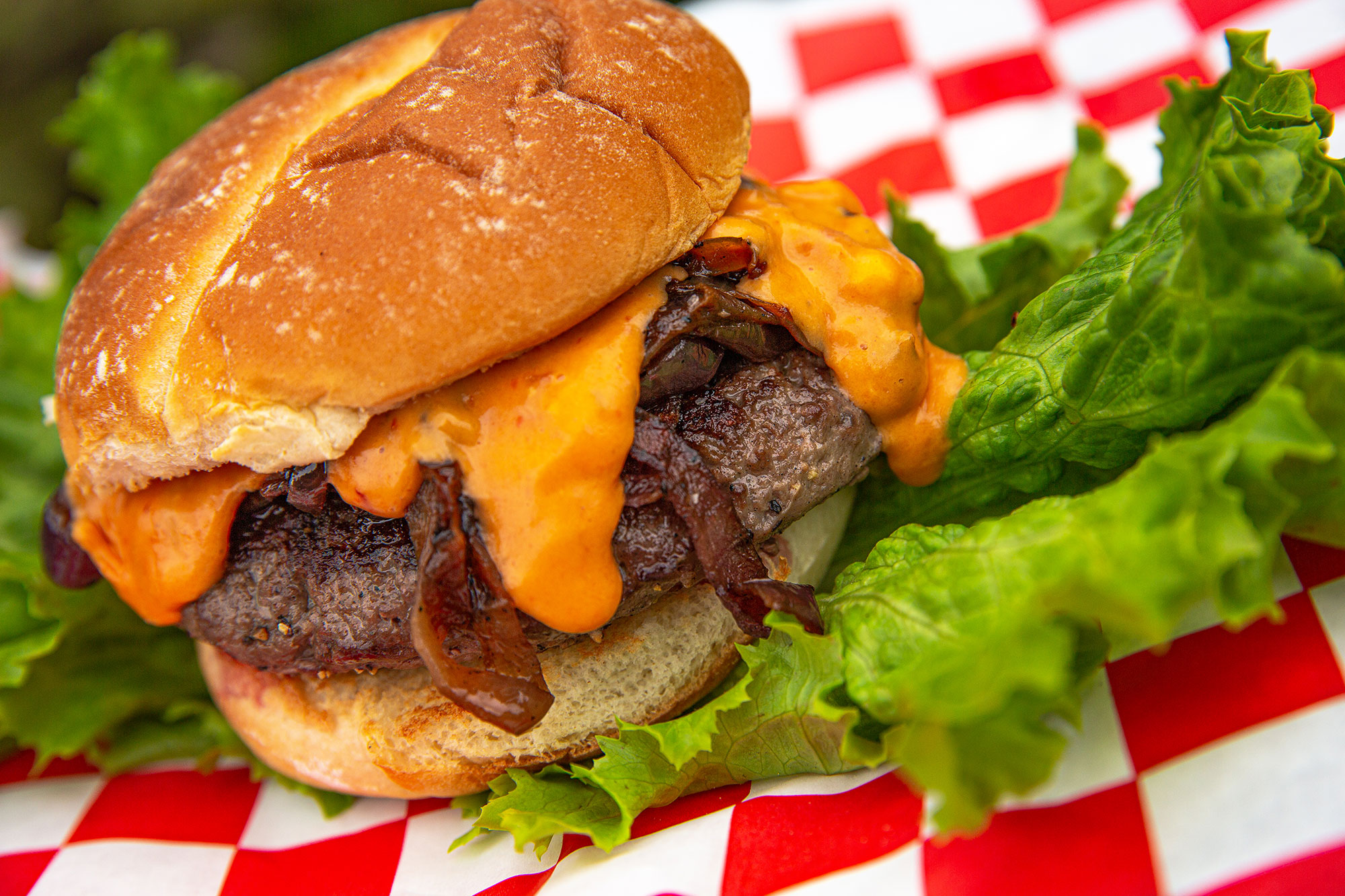 - Toast buns. Add mayo to bottom bun followed by burger, then caramelized onions and lastly salsa con queso (and top bun).
