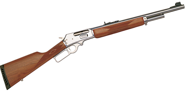 The Marlin 1985GS is a lever-action .45/70 carbine that can take on any kind of game and any kind of weather. This stainless steel 4 shot has an 18½-inch barrel with an overall length of just 37 inches. It weighs 7 pounds, and the average retail price is about $660. This is big game-dropping power in a short, weatherproof gun; and it's got "survival in bear country" written all over it. OL
