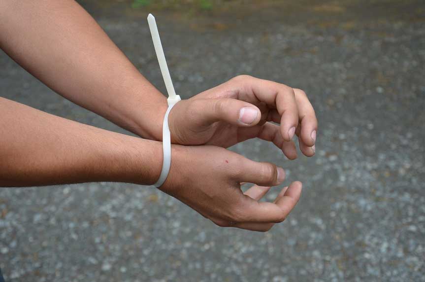 Imagine you’ve been kidnapped and bound with zip ties! Good thing your paracord laces do more than just hold your boots on your feet. You can use those laces as a saw. Aggressively working 550 cord perpendicular across a zip tie will weaken the plastic until it eventually breaks. To make your escape, remove your 550 laces and tie them together to make a single, long cord. Then tie a loop large enough to fit around your feet on each end. Thread the cord through the zip tie. Place each foot in one of the cord loops and move your feet back and forth like you’re peddling a bike. This will saw the cord back and forth on the zip tie and create enough friction for the plastic to get hot, and eventually melt and separate.
