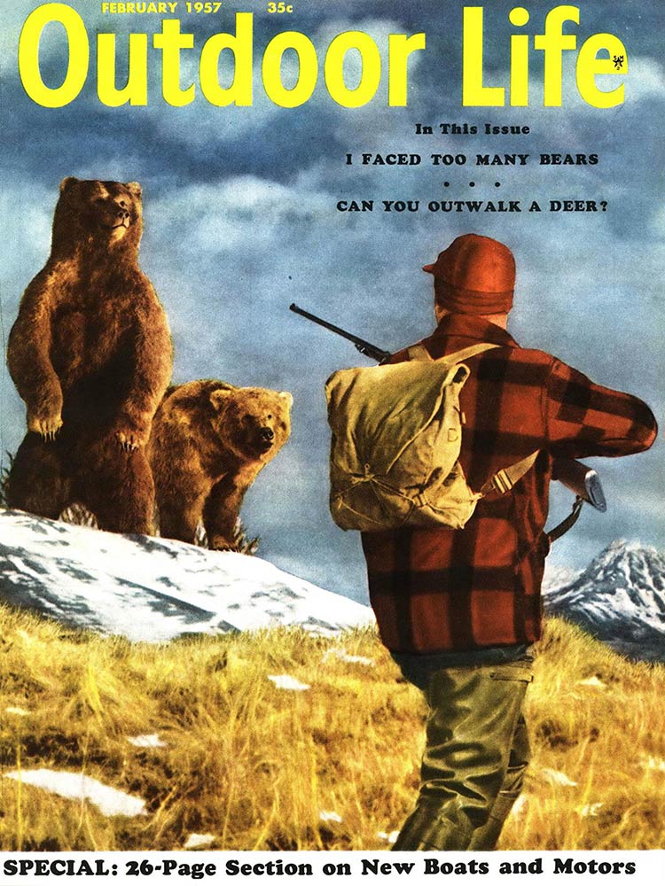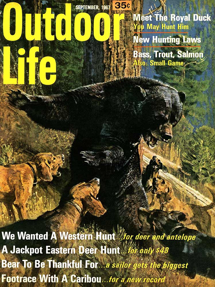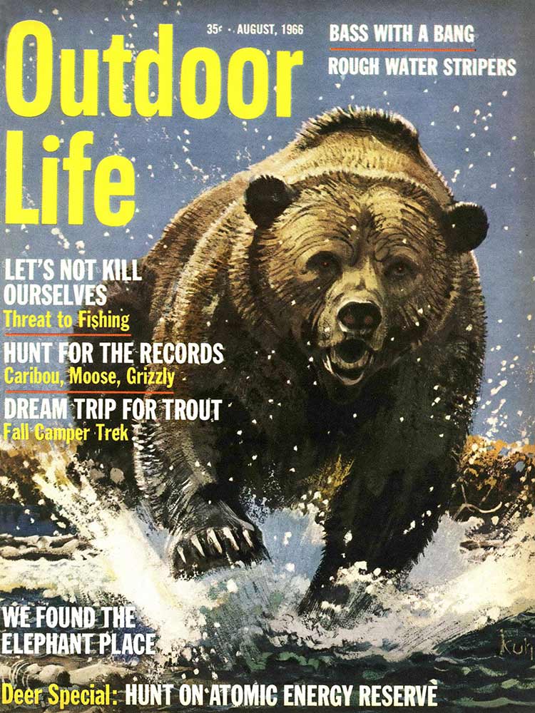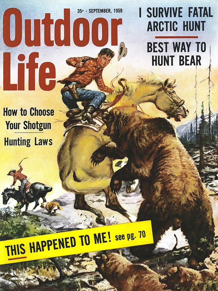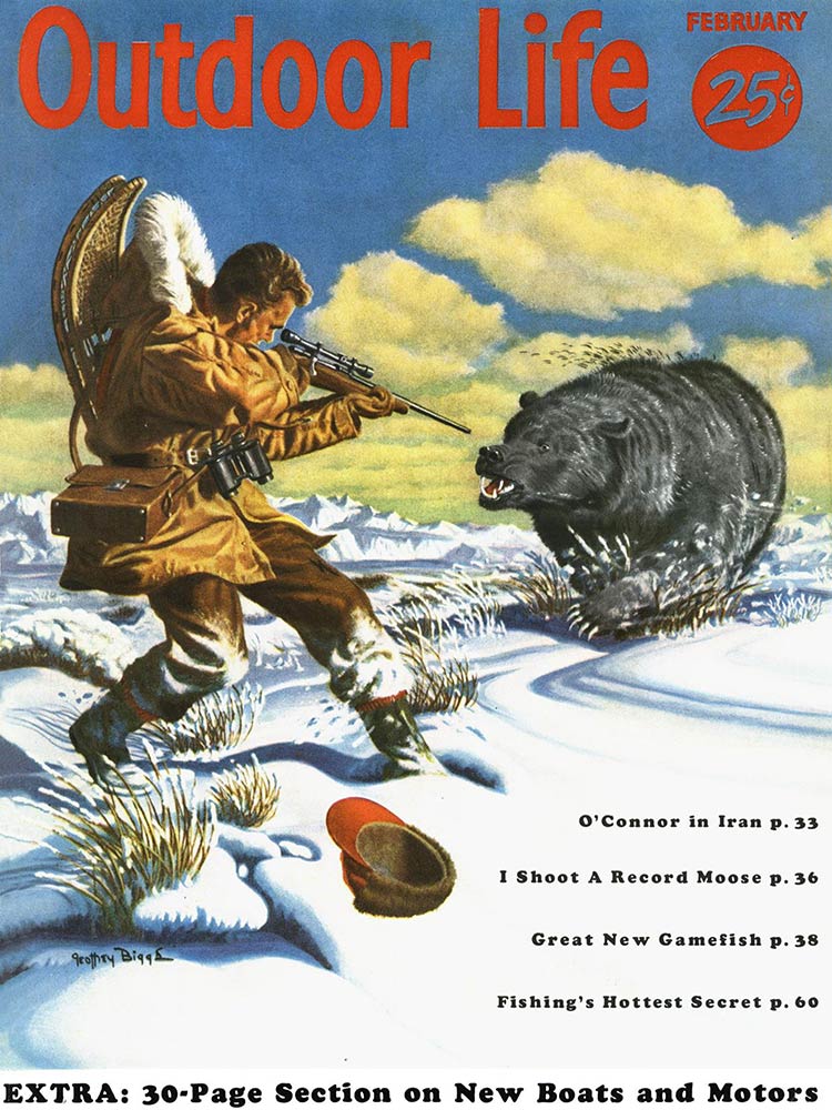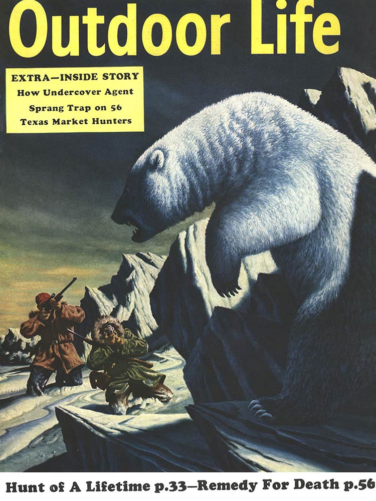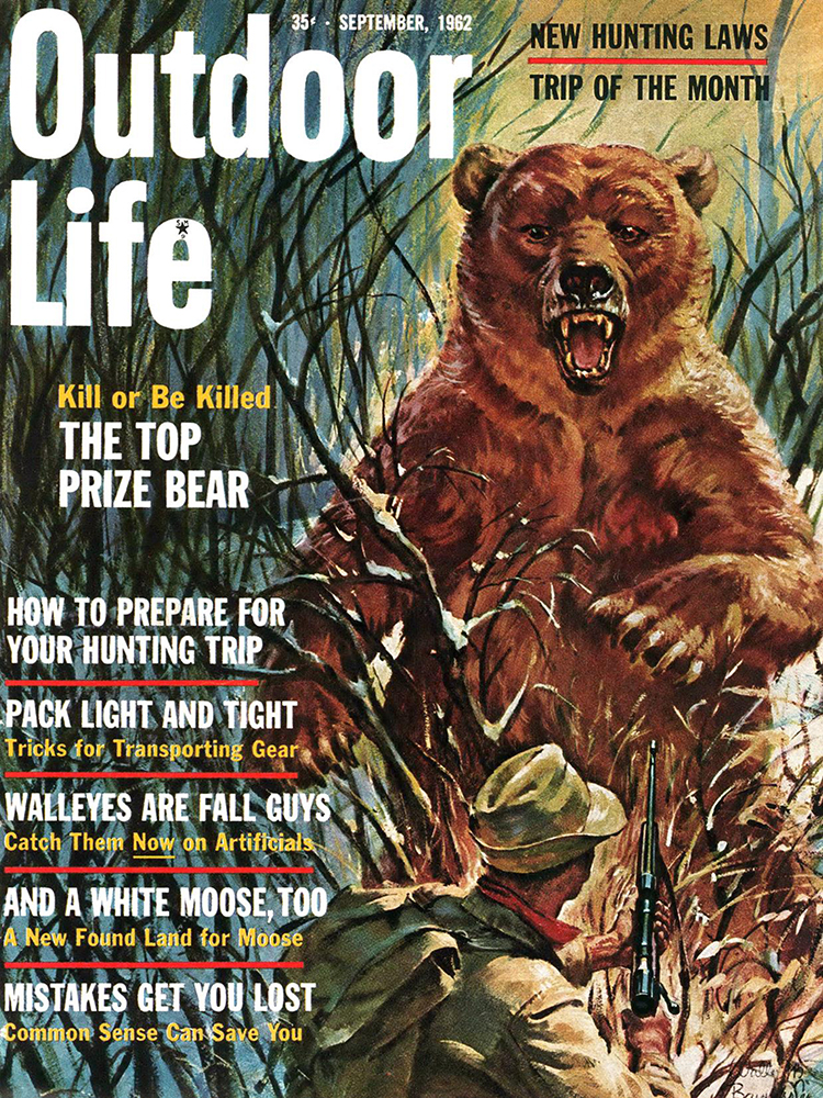 This roundup happens to contain my personal favorite cover out of all the OL covers, from the November 1961 issue. The composition is striking: the handsome bull elk in the foreground has clearly just hit the ground; the hunter on horseback who killed him is framed inside his antlers, rifle in hand as he rides to confront the grizzly who also seeks to claim the carcass. “Outdoor Life” is arranged boldly around the massive hump of the bear’s back. The warm fall colors and misty indigo mountains in the back complete the scene. In fact, I like this image so much that I framed it not once, but twice: It hangs both in my cubicle at the OL headquarters and over my kitchen table in my Brooklyn apartment (aka the home office).