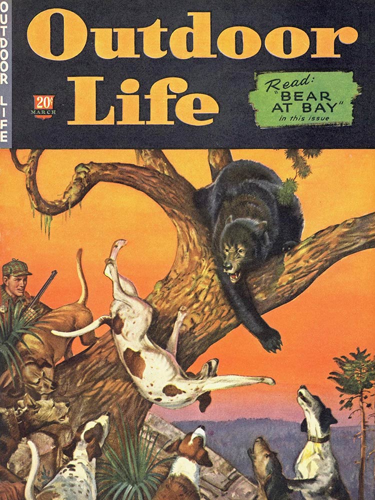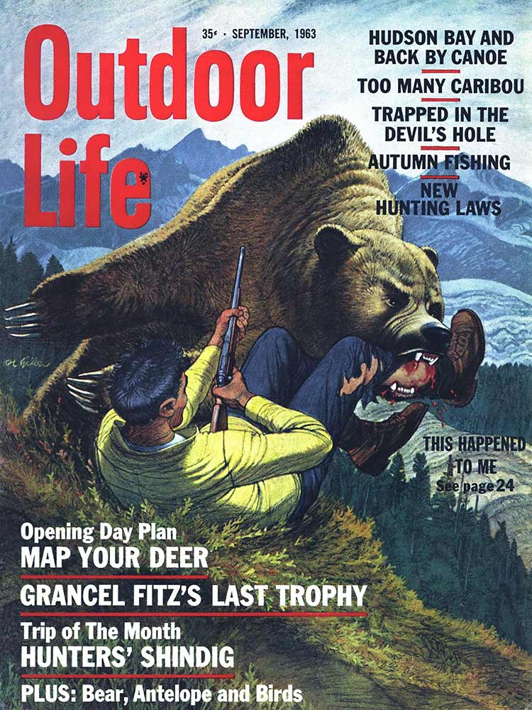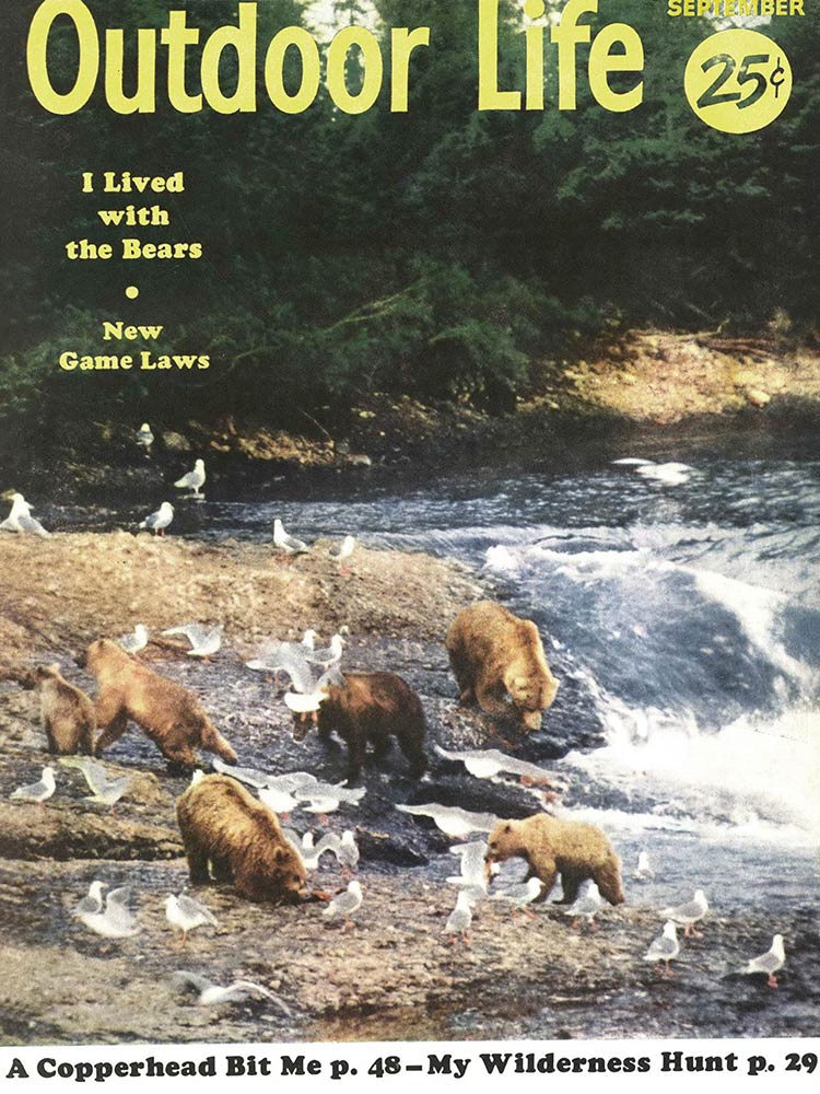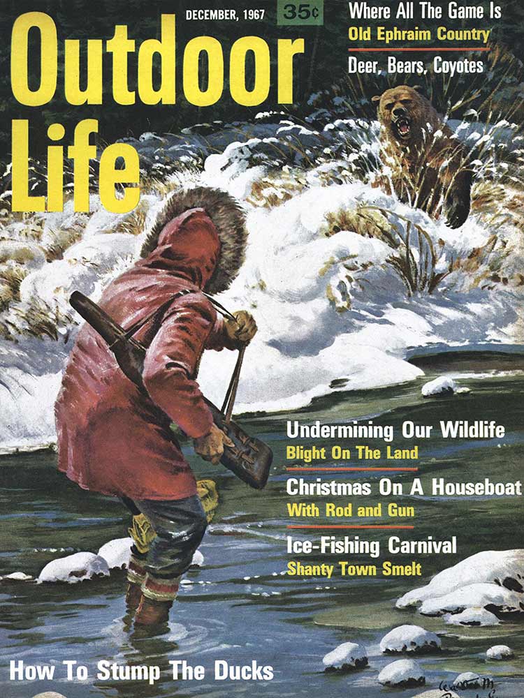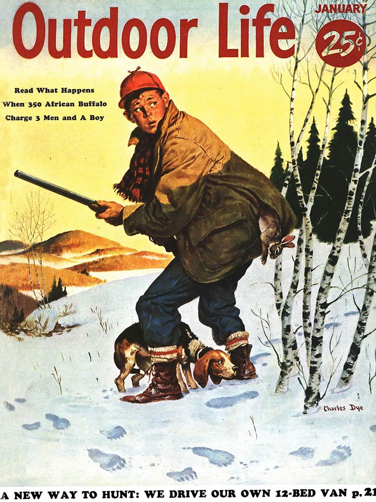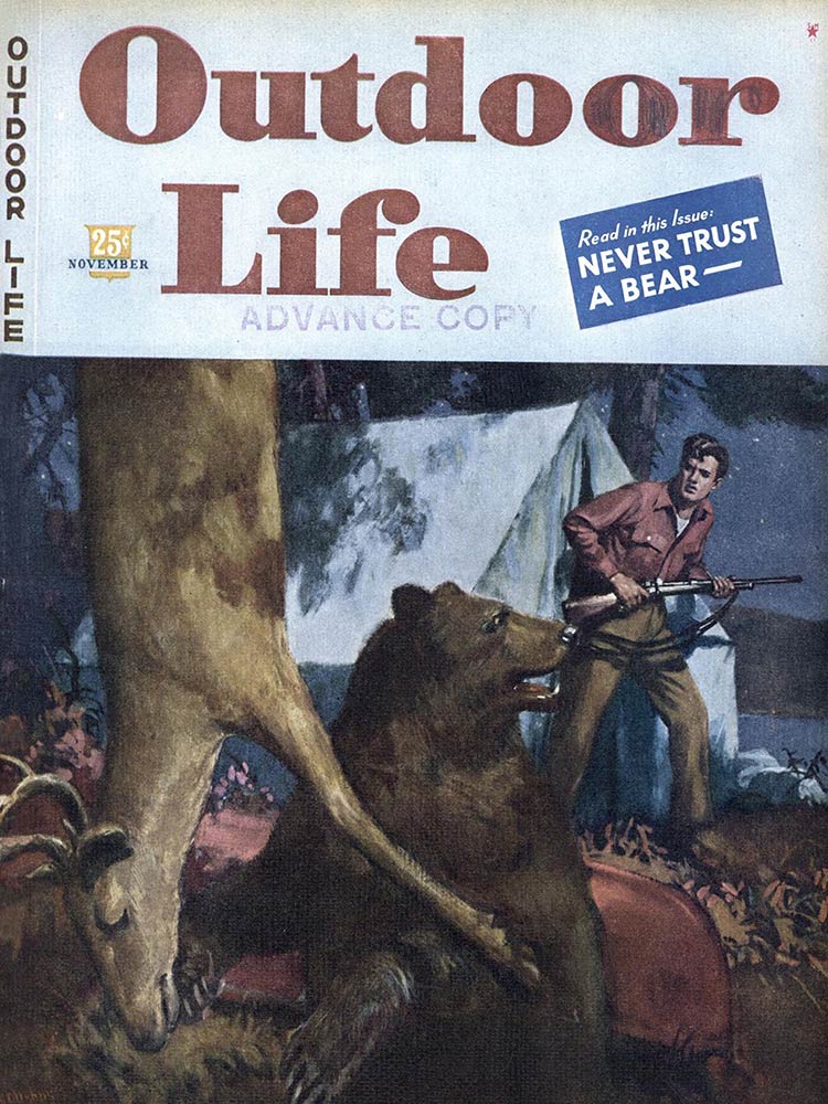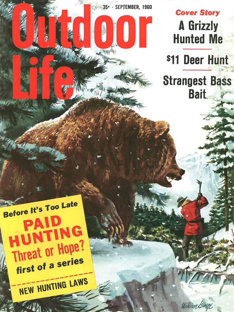 This roundup happens to contain my personal favorite cover out of all the OL covers, from the November 1961 issue. The composition is striking: the handsome bull elk in the foreground has clearly just hit the ground; the hunter on horseback who killed him is framed inside his antlers, rifle in hand as he rides to confront the grizzly who also seeks to claim the carcass. “Outdoor Life” is arranged boldly around the massive hump of the bear’s back. The warm fall colors and misty indigo mountains in the back complete the scene. In fact, I like this image so much that I framed it not once, but twice: It hangs both in my cubicle at the OL headquarters and over my kitchen table in my Brooklyn apartment (aka the home office).