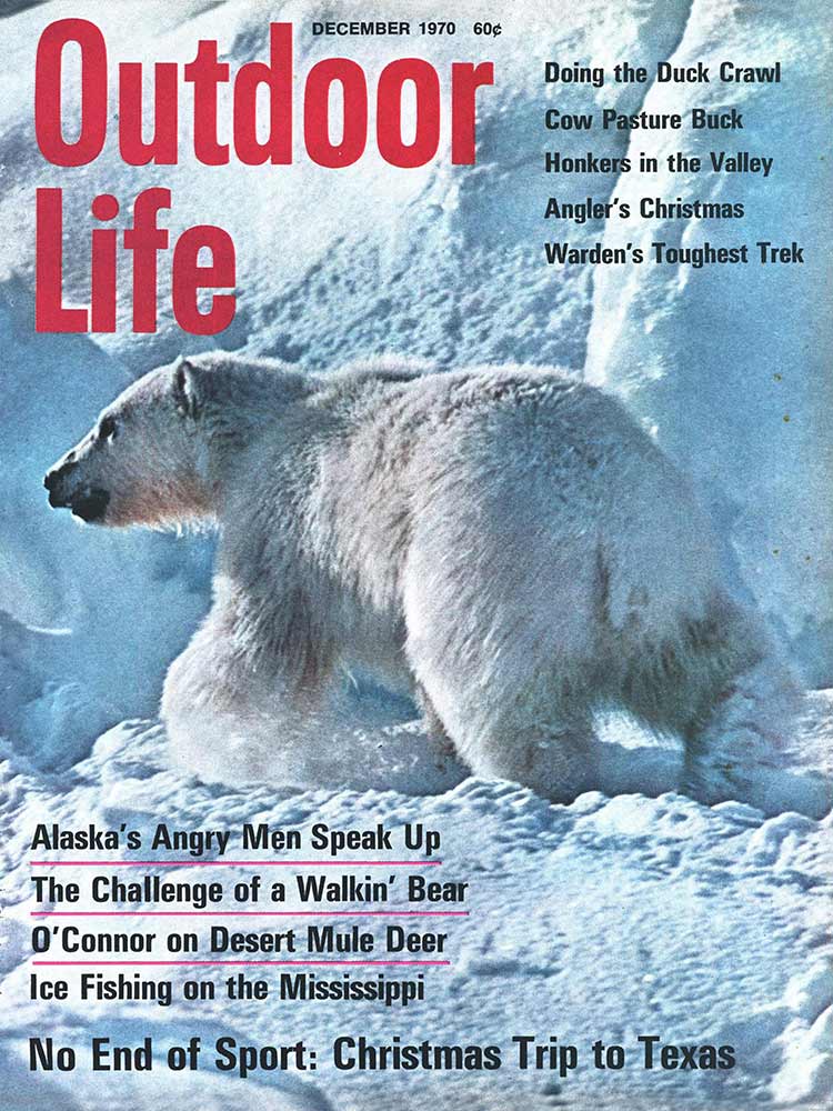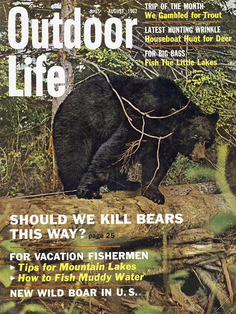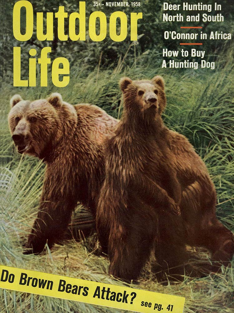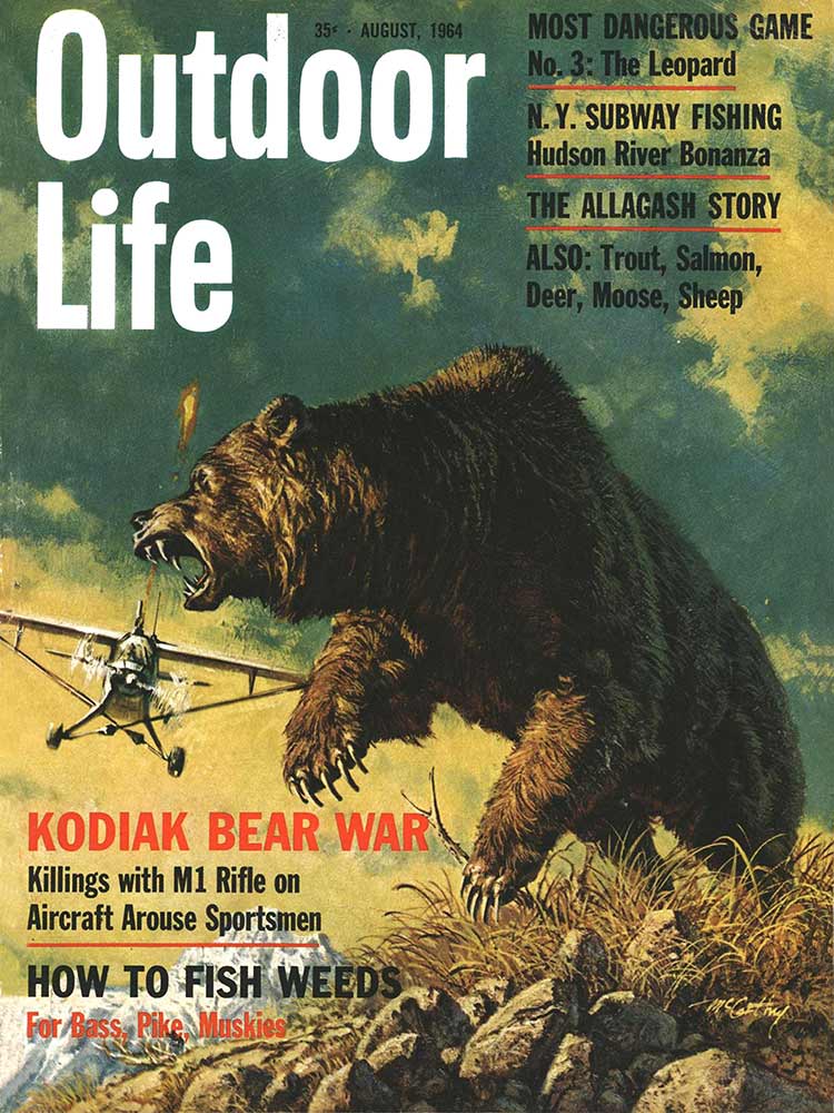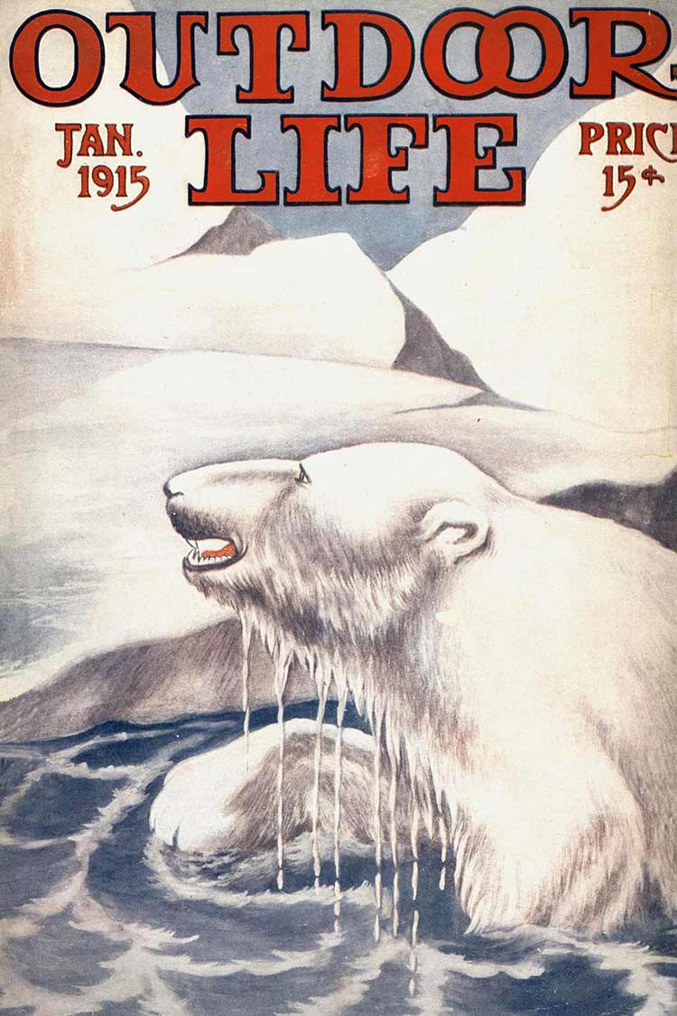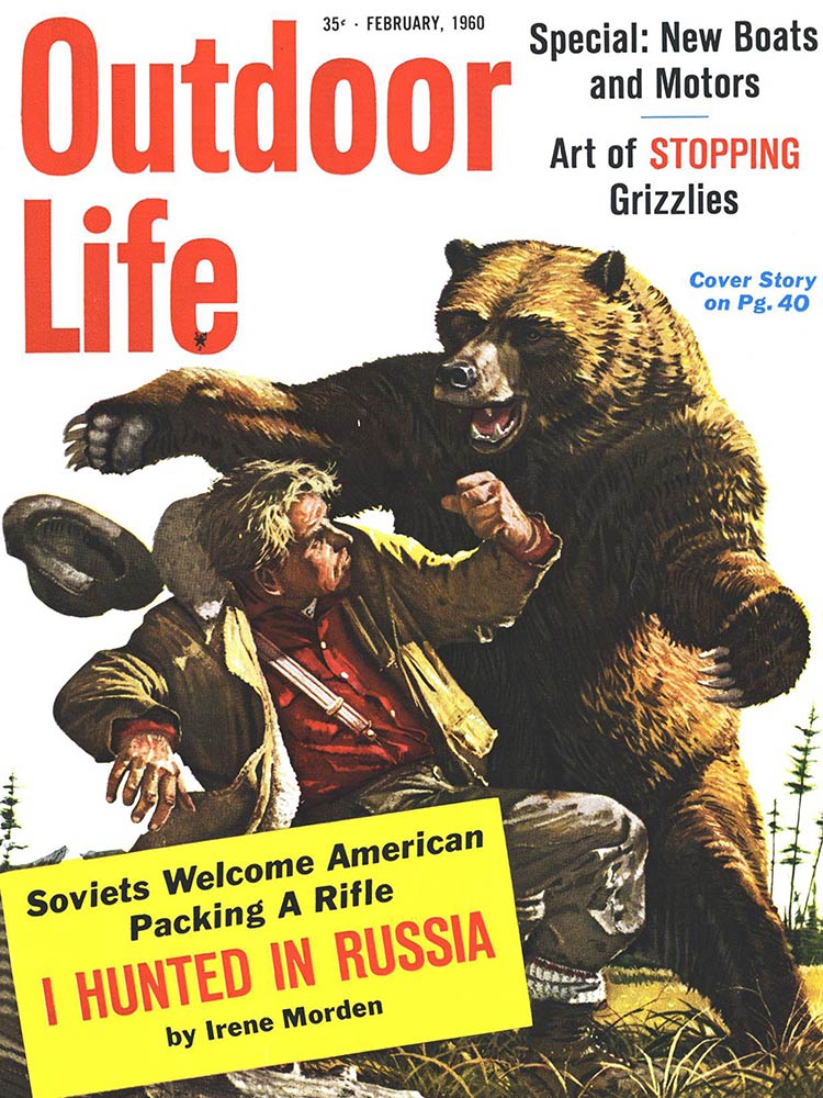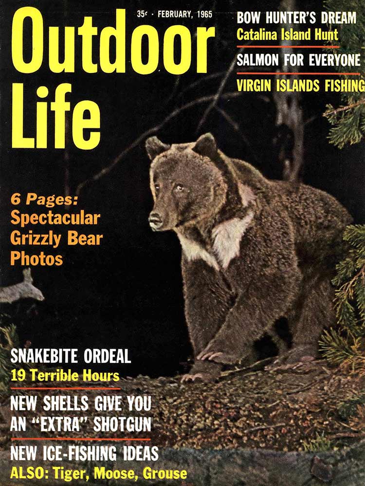 This roundup happens to contain my personal favorite cover out of all the OL covers, from the November 1961 issue. The composition is striking: the handsome bull elk in the foreground has clearly just hit the ground; the hunter on horseback who killed him is framed inside his antlers, rifle in hand as he rides to confront the grizzly who also seeks to claim the carcass. “Outdoor Life” is arranged boldly around the massive hump of the bear’s back. The warm fall colors and misty indigo mountains in the back complete the scene. In fact, I like this image so much that I framed it not once, but twice: It hangs both in my cubicle at the OL headquarters and over my kitchen table in my Brooklyn apartment (aka the home office).