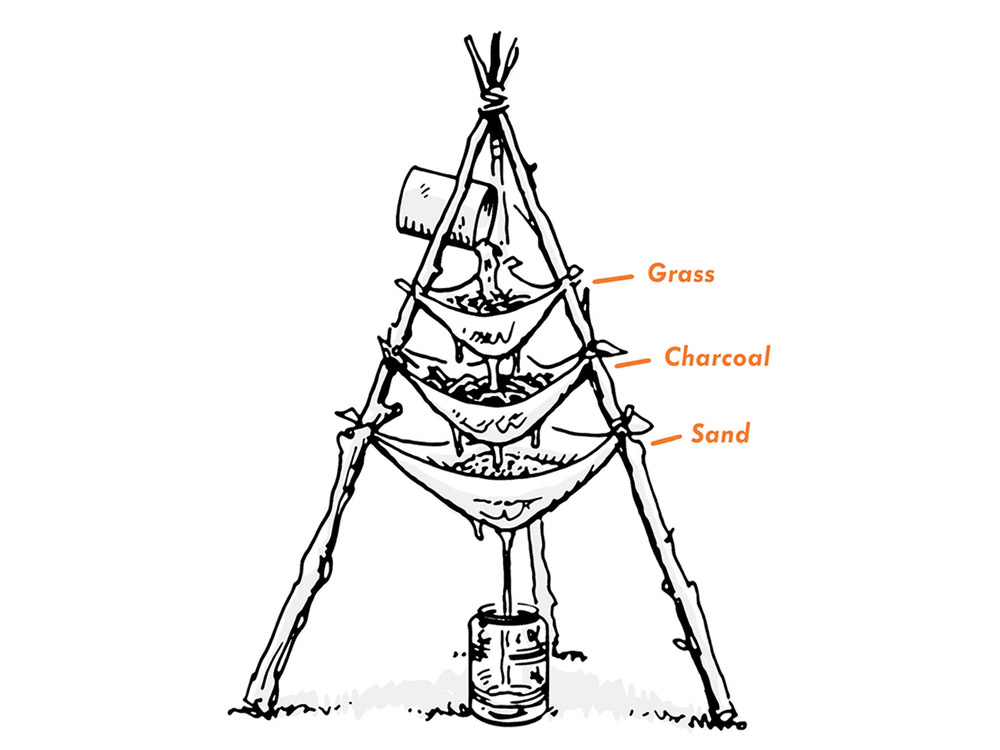 This basic filtration system is easy to assemble in the field for treating foul water.