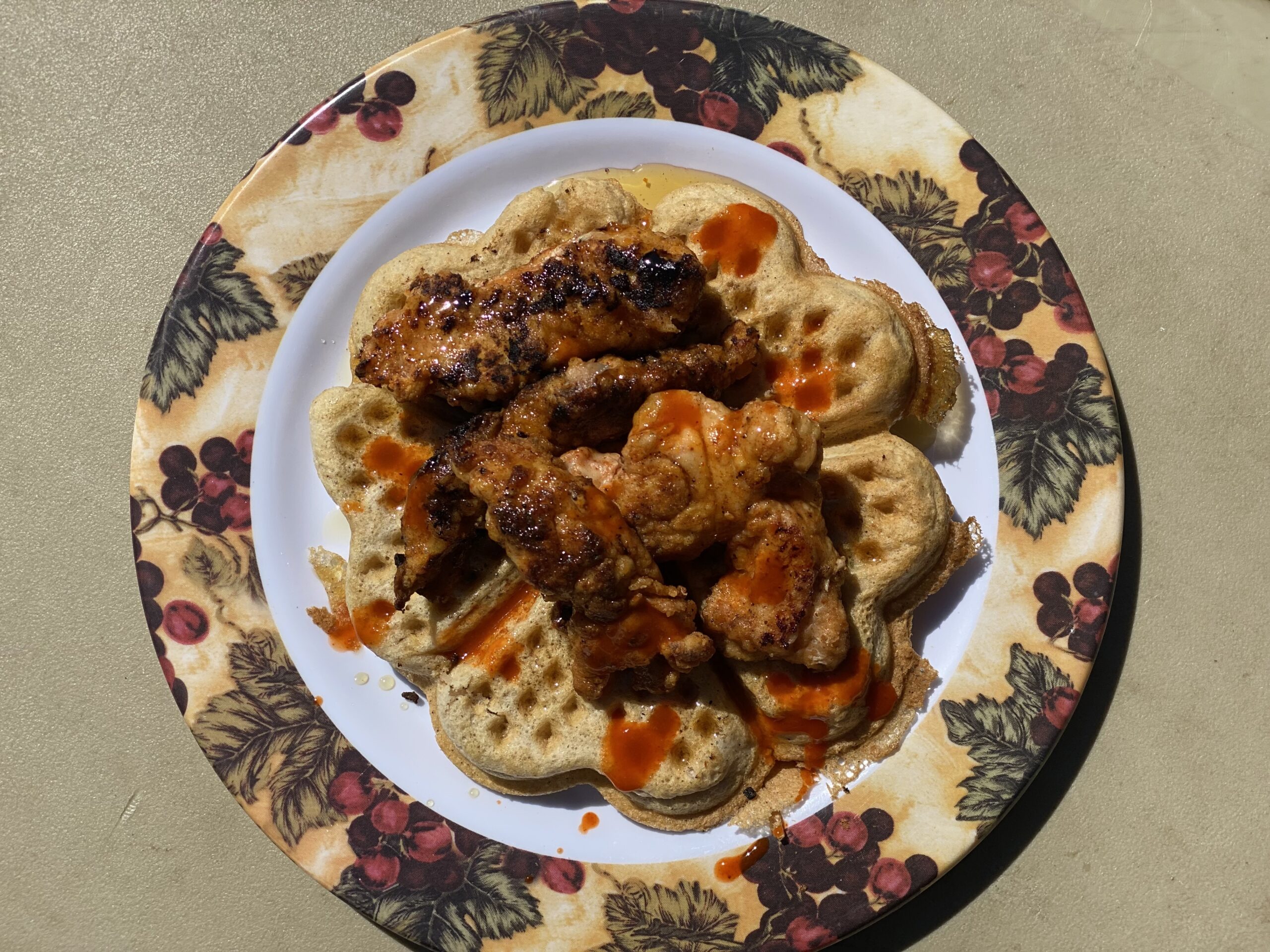 - Top each waffle with chicken strips and cover with maple syrup, hot sauce or both.