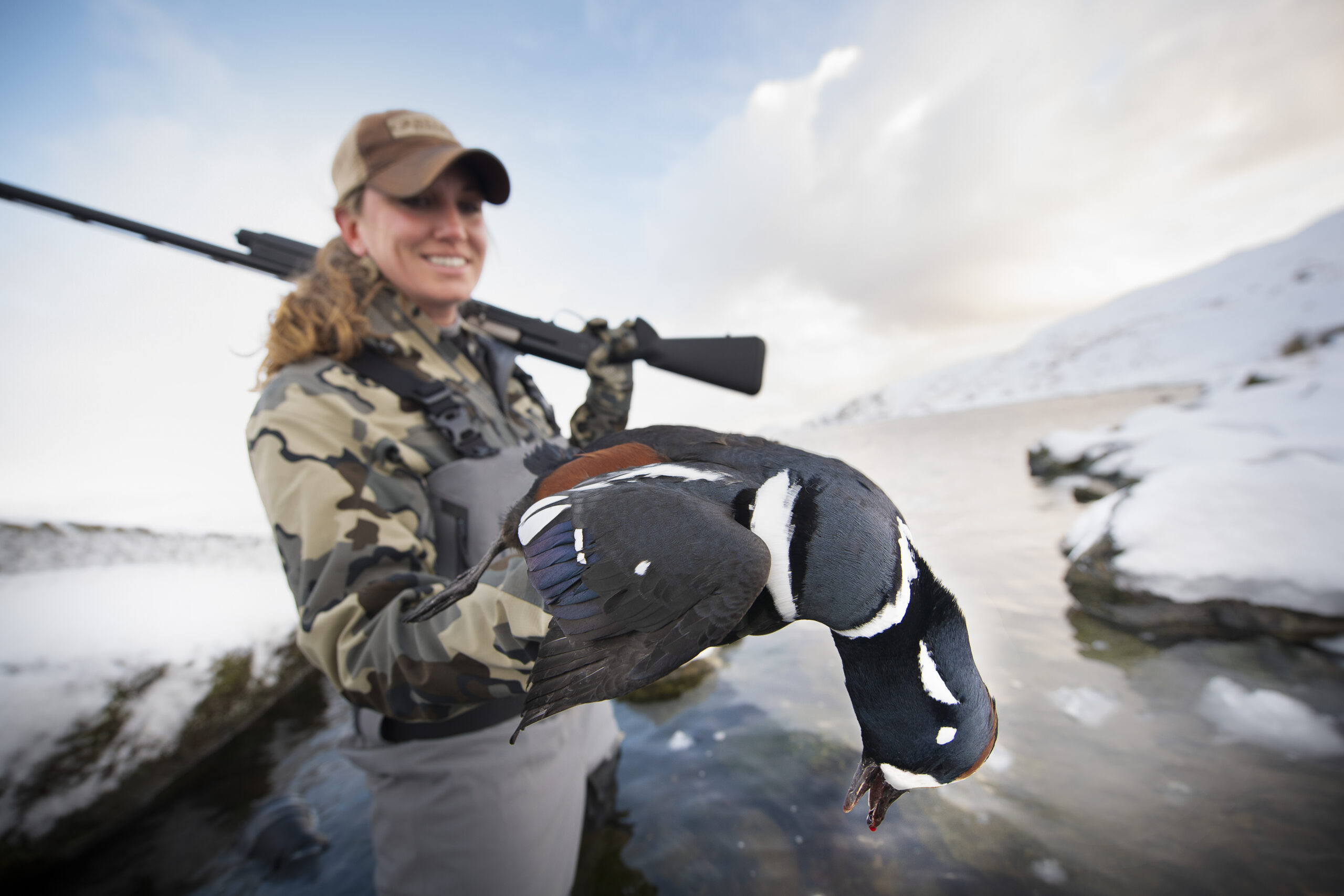 On our first hunt, Cory drops us in a cove near the harbor amid jagged rocks and sloshing surf. The birds trickle in, and I’m slow with my swing. I see instant confirmation that I’m behind as my shot throws up a spray of seawater behind a harlequin.