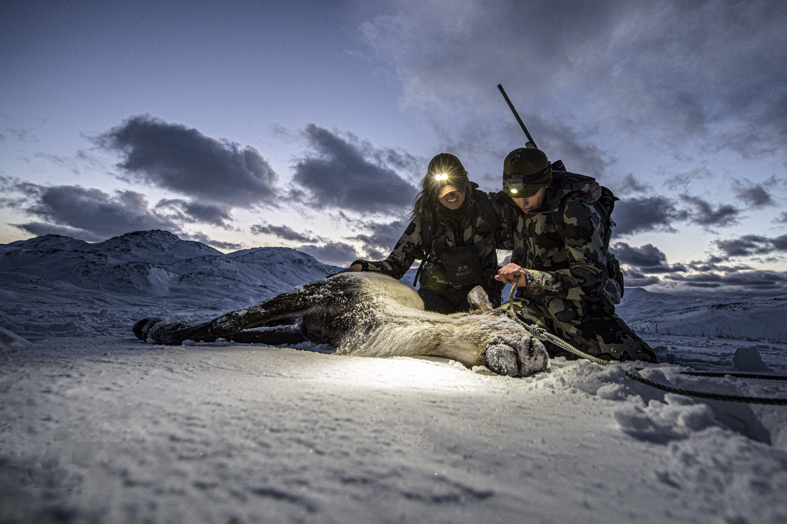 The nonnative caribou aren’t going anywhere either, although I’m not upset about it. Late one day Kali and I spot a herd feeding on the far side of the lake. We swap her shotgun for my rifle and wade into the snow-choked grass again, sinking to our waists in spots. It takes longer than it should to close the two miles, but at least the wrinkled terrain hides us. When I finally get into position, 180 yards away, all the caribou are bedded, except for one cow on the edge of the group. Her rump is pointed at me, and I watch from my belly for 20 minutes as the sun sinks and my hands grow numb in the wind. At last she turns, and I squeeze the trigger.