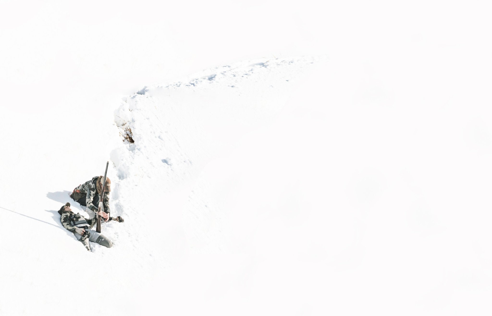 After that, I tackle my next ptarmigan, diving down the mountain after it and somersaulting into the snow. One day we go straight from the boat ramp, which is how I end up hiking three miles in a pair of Orvis waders. Kali and I get caught in a blizzard, the kind of squall that howls down the mountain and out to sea, lashing ice against our faces. A minute later, it clears. Our afternoons blur into a routine of chasing birds, listening to Nirvana, and pushing trucks out of the snow.