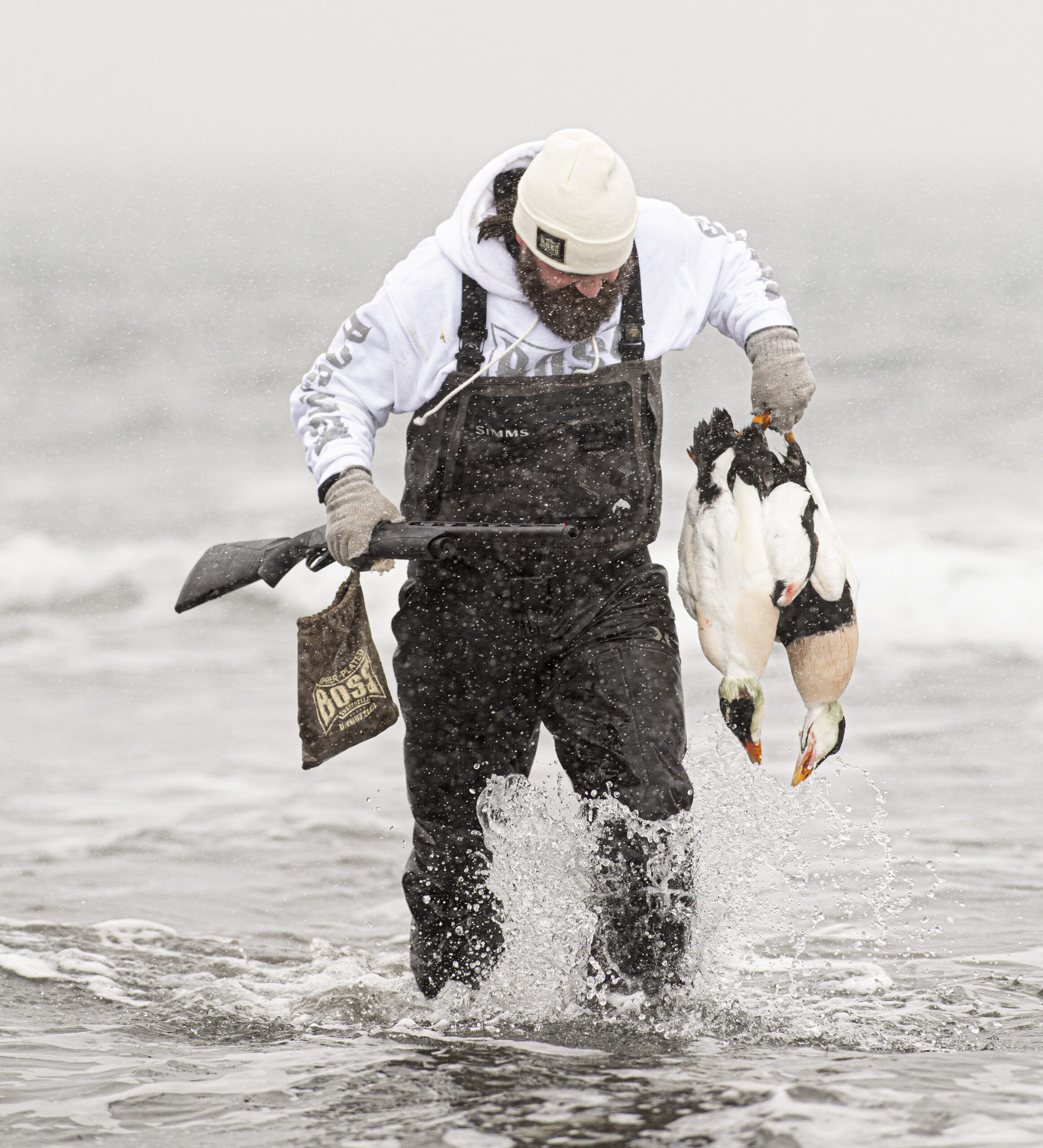 It’s a good thing we’re not fussed about numbers, because we’re at the mercy of luck and weather. The winds and snow pick up, making the sea too rough for boat travel. Instead, we pile into the trucks to hunt a sheltered lagoon. Buffleheads bomb in, and greater scaup too. We watch a V of emperor geese descend over the bay toward another group of hunters, several of whom have tags. The emperors land short, and no shots boom across the flat.