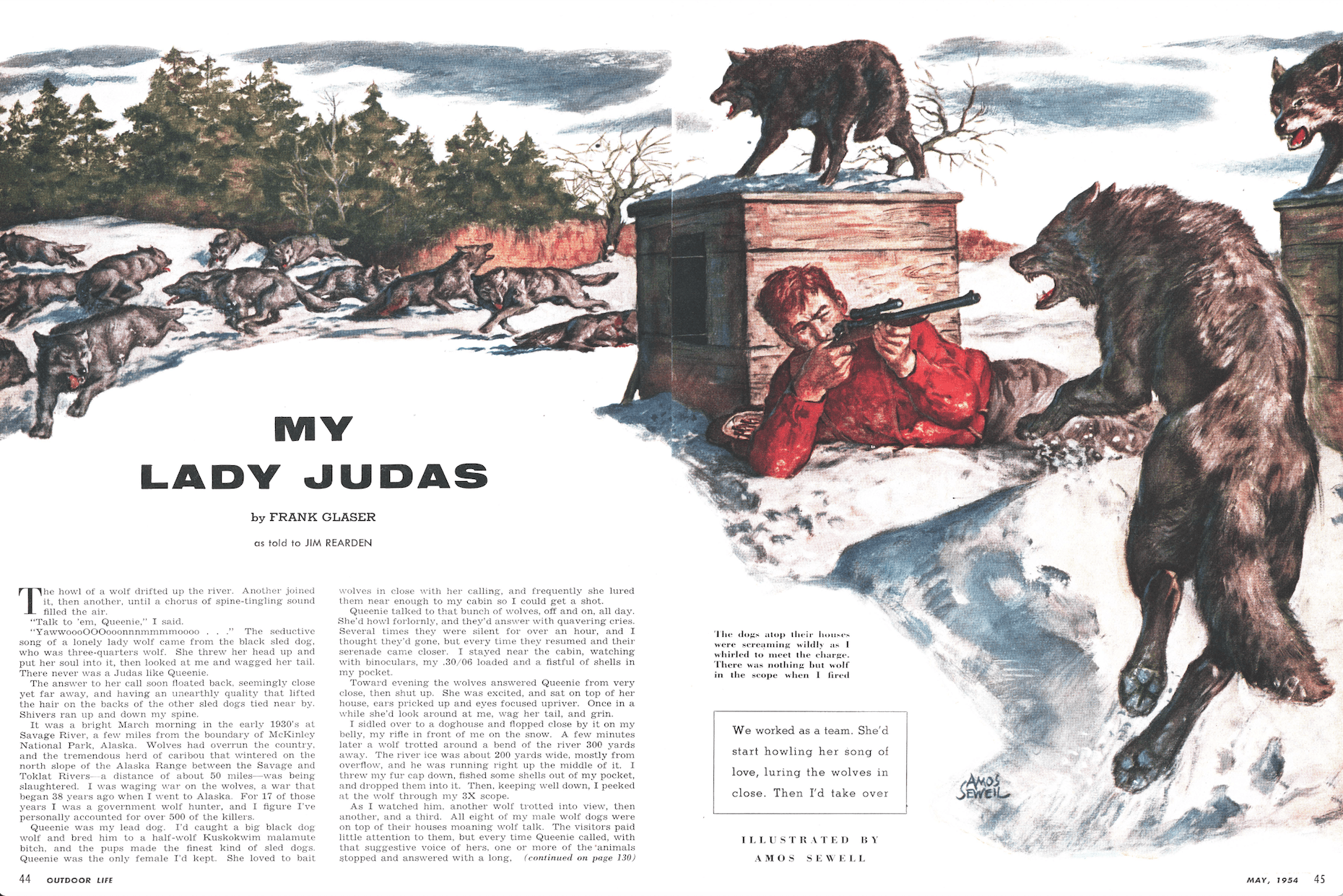 By the time Rearden caught up with him, Glaser had been a market hunter, roadhouse owner, dog-team freighter, trapper, wolf-dog breeder, big-game guide, and predator-control agent. Glaser possessed “an encyclopedic knowledge of Alaska’s wolves and other wildlife.” In one iconic tale, he used his favorite female wolf dog to howl in a pack of wild wolves.