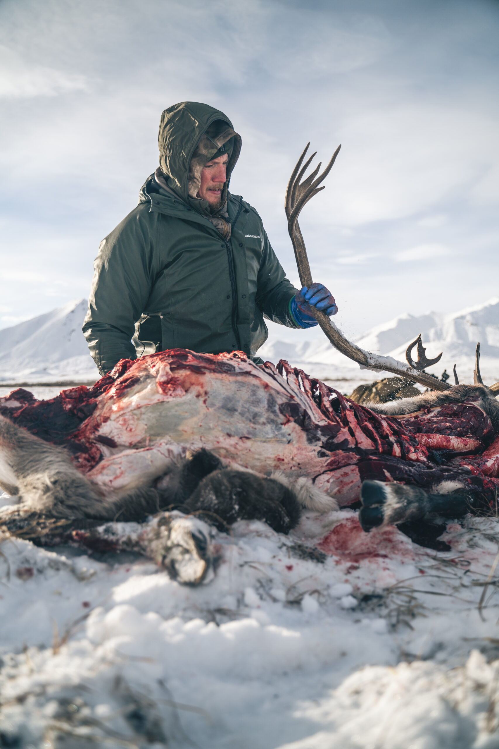 After the herd moved off, I walked up to my bull, still in disbelief. This beautiful white-caped bull at my feet was the true embodiment of the Arctic. As a hunter, I always experience a sense of thankfulness and relief when I can finally put my hands on an animal that I’ve hunted, and I felt that with this bull.