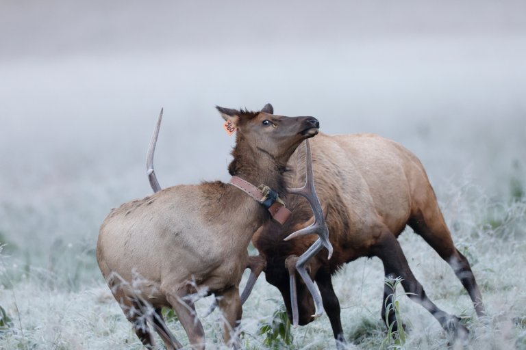 I was in a state of calm disbelief. Somehow I accepted that, aside from the timing and placement of my arrow, the situation was totally out of my control. I expected the bull to come out of his skin as soon as I moved, but he didn’t even notice me until I hit full draw. His head turned toward me at some point, but I only remember checking off my shot process. Anchor, good alignment, aim, expand—and the arrow disappeared into the bull. I wanted to hit him through the meat of the front shoulder to fully catch both lungs, but my arrow went a little high and left. The bull crossed the creek in a sprint then turned back. I stood to watch him as he ran about 150 yards back to meet the confused herd. The second the bull stopped running, another big bull ran up, hooked his antlers, and threw my bull on the ground, thrashing him as if my bull owed him money.