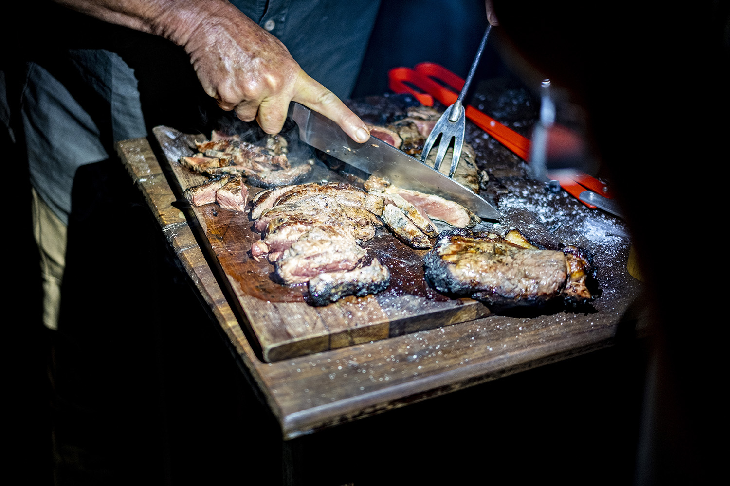 That night we feasted too, eating the bull’s liver and Africa’s version of Rocky Mountain oysters. Abe Smit, who ran the camp, took cuts of meat and tossed them into the flames in our fire pit. He turned them once, pulled them from the fire, and used a knife to scrape off the smoking coals. We grabbed slices of meat, hot and dripping, with our fingers and dipped them in a pile of salt on the cutting board and ate like kings.