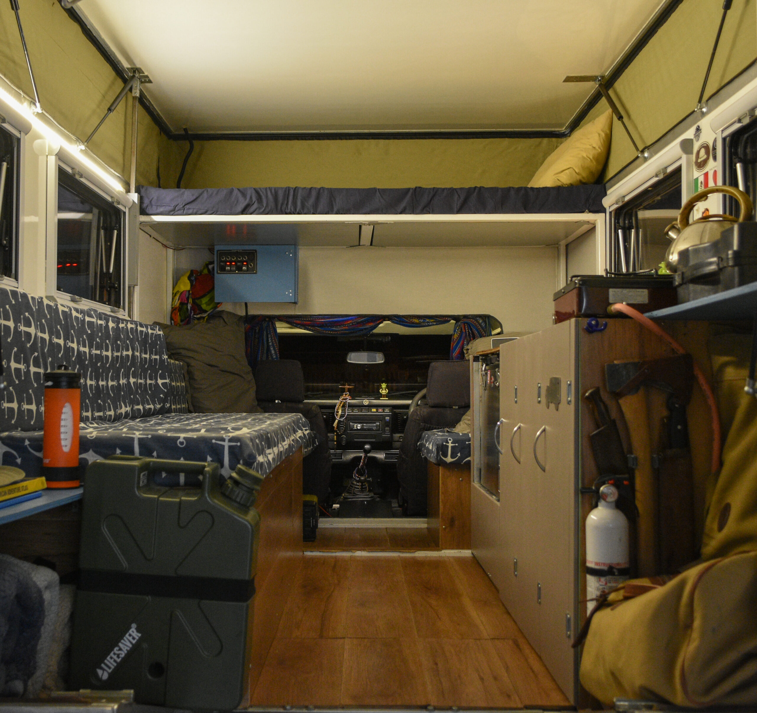 For the kitchen we sourced an outstanding fridge-freezer unit from Snomaster (the 60-litre BD/C 60 Classic with low voltage cut off and a solar powered remote control), a dual gas burner stove complimented by a Coleman collapsible oven, and a basin mated to 100 liters of water. Each occupant also needed a full-size bed to sleep in. The solution was to build a bunk bed within a security frame. The lower bunk was formed by joining the two rear seats, and the top bunk was available when the roof was lifted horizontally. A large storage box along the one wall would double as a bed and the back cushions became a bed in the walkway. My wife and daughter would share a bed if we were unable to lift the roof while camping in a city or questionable areas.
