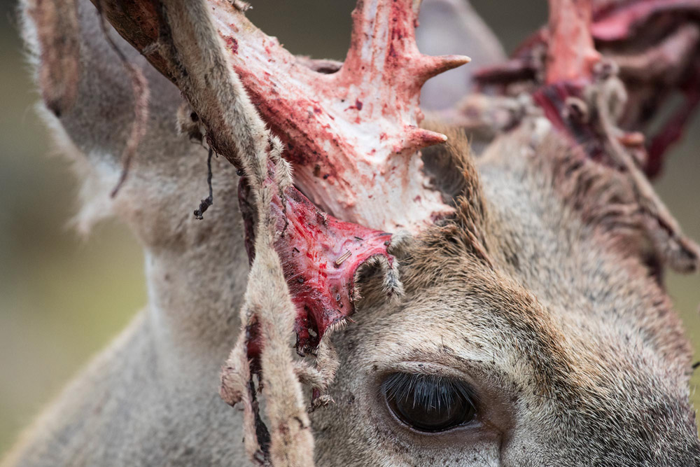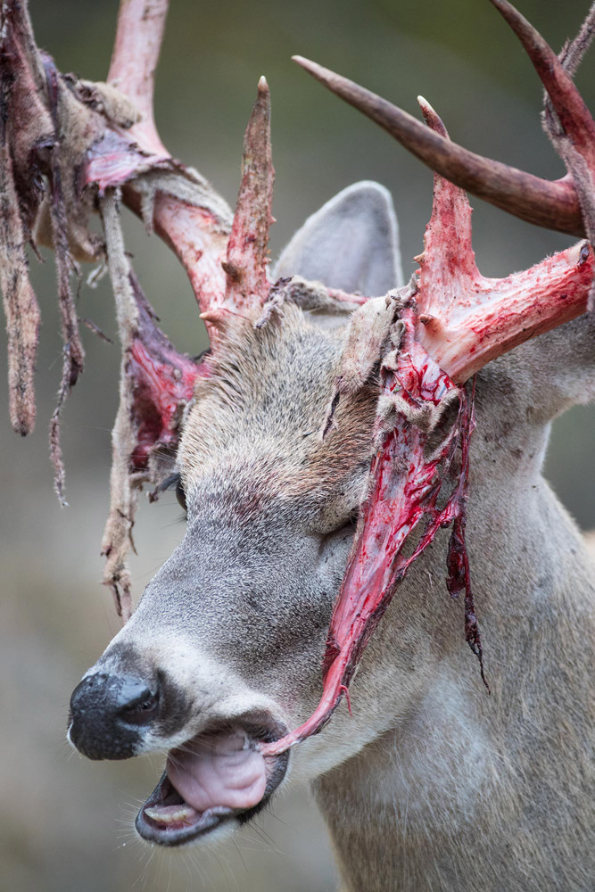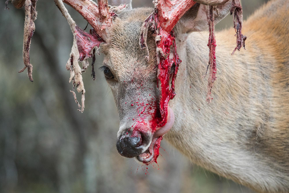 “I then noticed that the buck didn’t have the velvet stuck in his teeth or throat. He was just trying to eat it but it was still attached to the base of the antler. The more he pulled the more he bled and every so often he would stop chewing on the velvet so he could lap up the blood as it rolled down his face.”