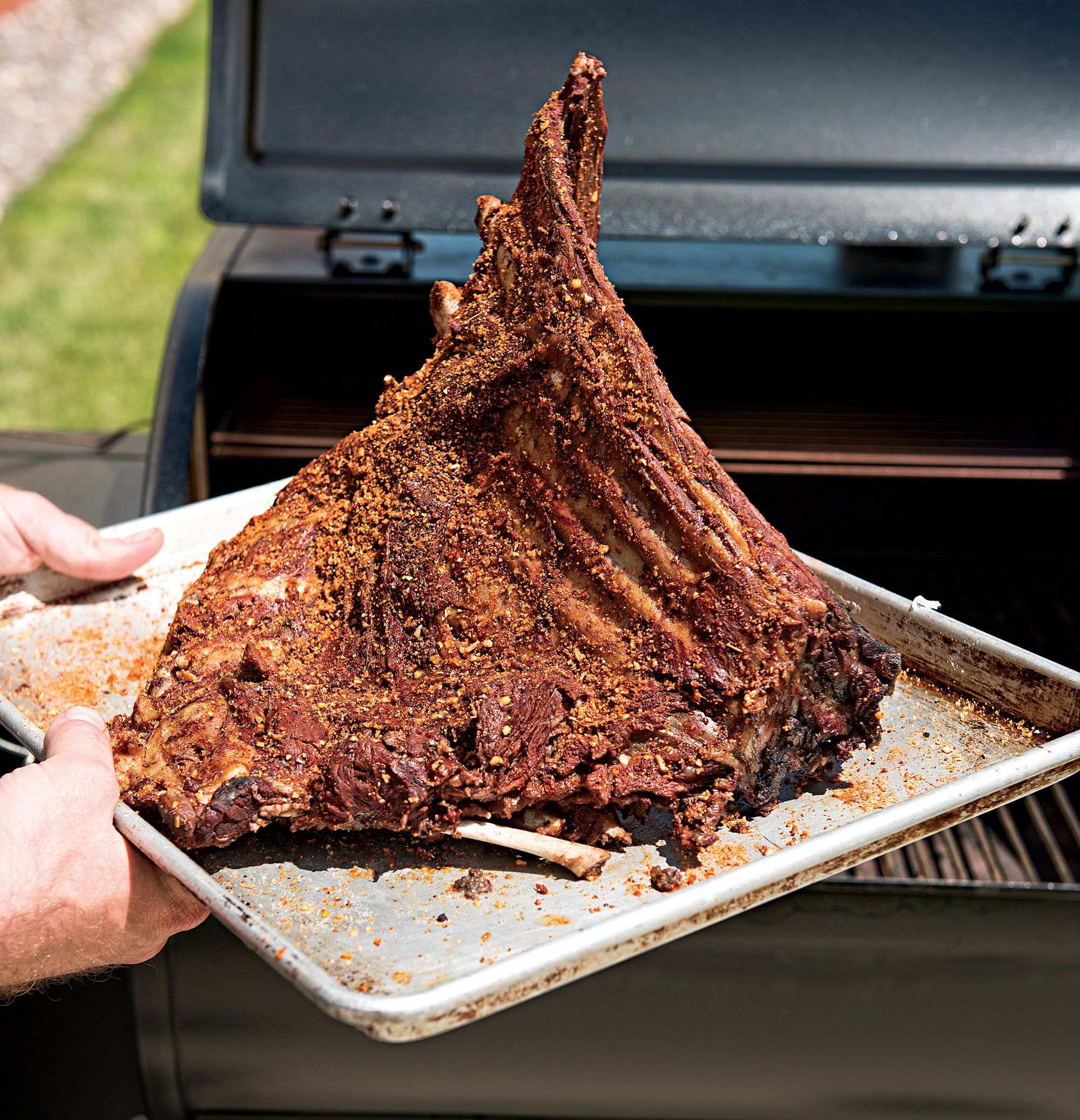 4. Smoke the ribs for 1 hour. A Camp Chef SmokePro Pellet Grill on the low-smoke setting is my go-to. If you don’t have a smoker, use a lidded grill with natural hardwood lump charcoal and add wood chips. Move the charcoal dand wood chips to one side of the grill and smoke the ribs on the opposite side, being careful to not let the grill get too hot.