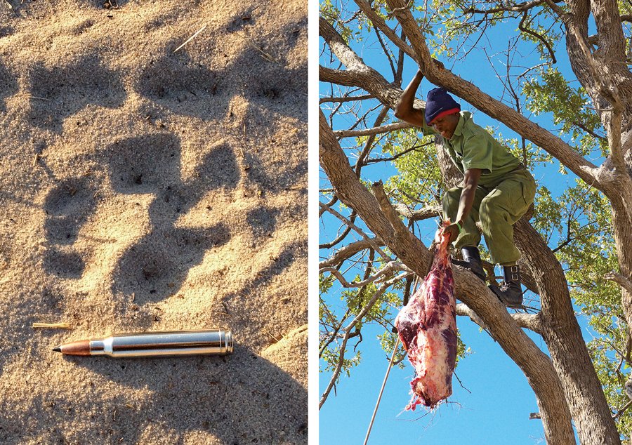Broom checks his watch. Two and a half hours until sunset. The trackers and Meka, the Zimbabwean game scout assigned to my safari, build a grass blind 65 yards downwind of the refreshed bait. Broom and I return to camp to gather provisions and mattresses to lay on in the blind.