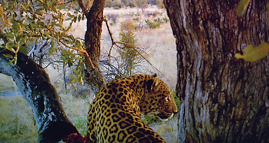 But the leopard’s had enough. He’s turning, going down the tree. At the edge of the trailing light he coils to spring. For a split second I have a sight picture and fire. The light goes out.