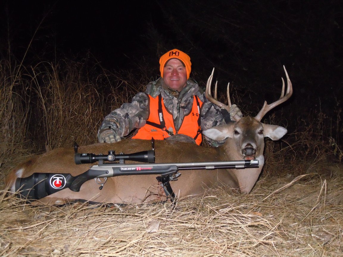 Finally, on the last evening of my hunt a nice 4×4 revealed itself for a few seconds in a wooded opening next to a cornfield. In an instant I had my Nikon riflescope on the buck, but he felt uneasy and started sneaking back into the cover. I barked like a coyote and the buck paused one more time for me to light the fire on my Thompson Center Triumph. The Hornady bullet put him down a few seconds later in midleap.