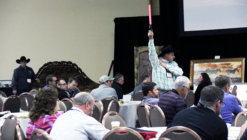 There are 12 men with cowboy hats spread throughout the crowd holding neon red wands. On projection screens behind them flash images of deer and salmon, and above it all stands the man in charge. The auctioneer.
