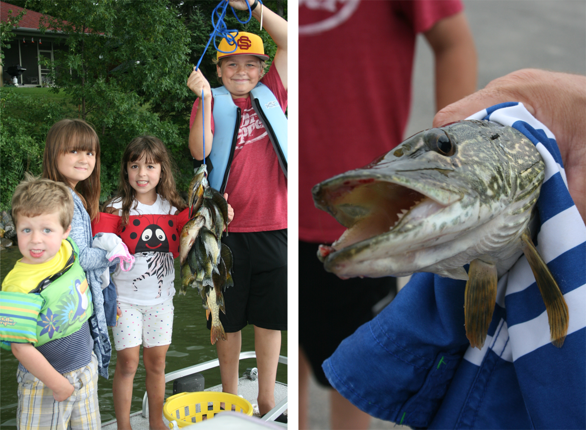 My kids caught perch and sunfish and rock bass and my nephew Henry caught a decent sized northern. I watched as my daughter and my niece would fish for a few minutes and then get bored with it and jump off the dock and swim for a bit. Then they would come back and try fishing again. They started the week needing an adult to help with the worms and taking the fish off the hook and by the end of the weekend they were doing it all on their own. They even managed to fill a stringer and we had our selves enough fish for a fish fry.