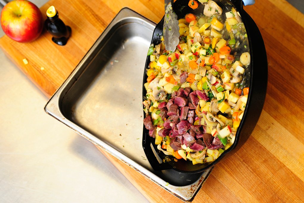 Once the mixture has reached it’s silky thickened state of deliciousness, add the brined crow breasts to the pan. Basically we poach the breasts for a little bit in the vegetable sauce to partially cook them. At this time we also add the diced apple to hit the meat and veggies with a hint of sweetness.