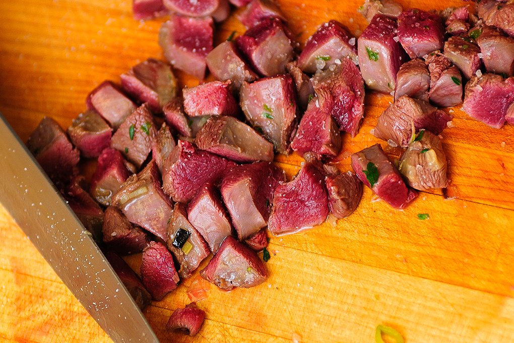 Once the meat is partially cooked, remove the cast-iron pan from the stovetop, and remove the breasts to a cutting board. Dice the breasts and add a little salt, too.