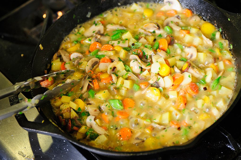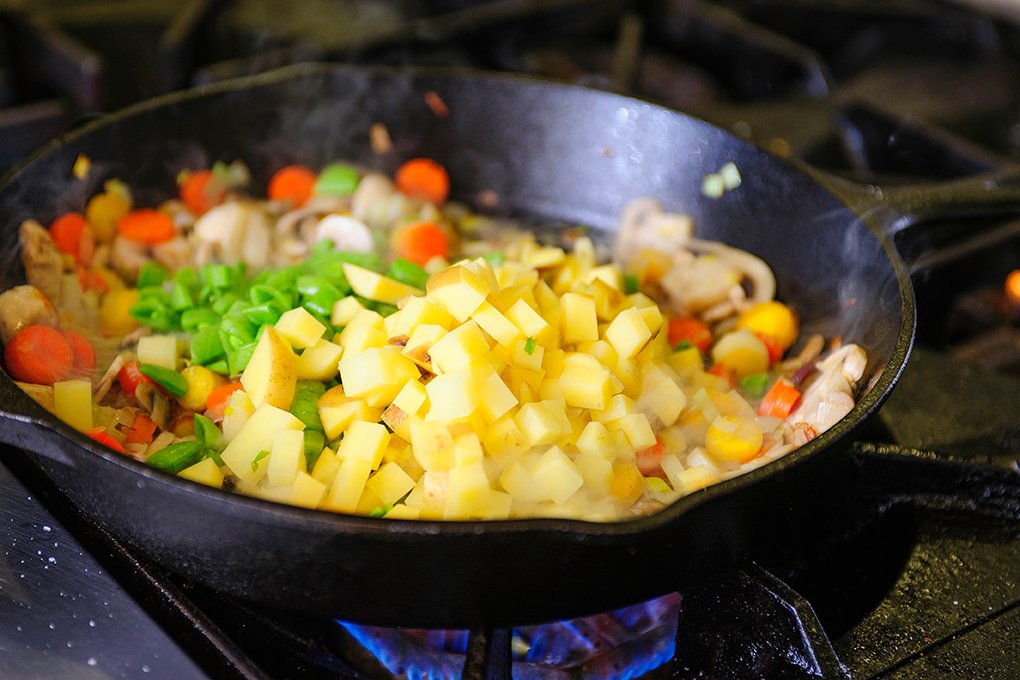 Heat 12-inch cast-iron skillet over medium heat. Add butter, or bacon grease if you have it. Sauté leeks and mushrooms for 2-3 minutes to cook off the water in the vegetables. Add carrots and more fat, as needed. Add about ¼ teaspoon salt. Cook another 5 minutes.