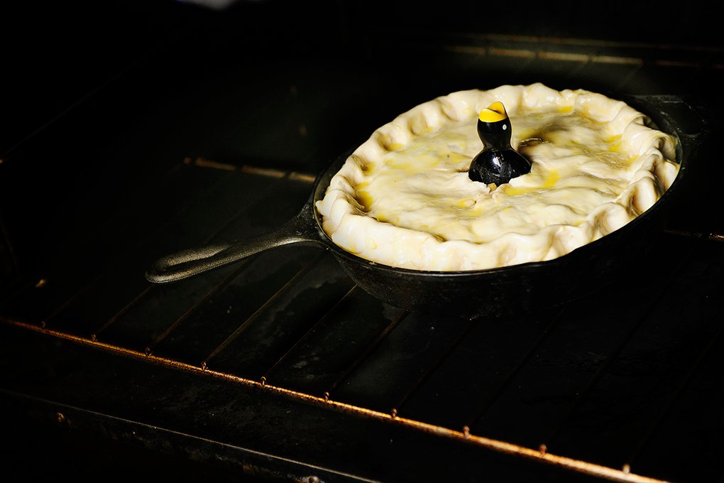 Now it’s time to add the cooled mixture into to the skillet. Set the bird in the middle, top with second crust, fold under and pinch the edges however you want.