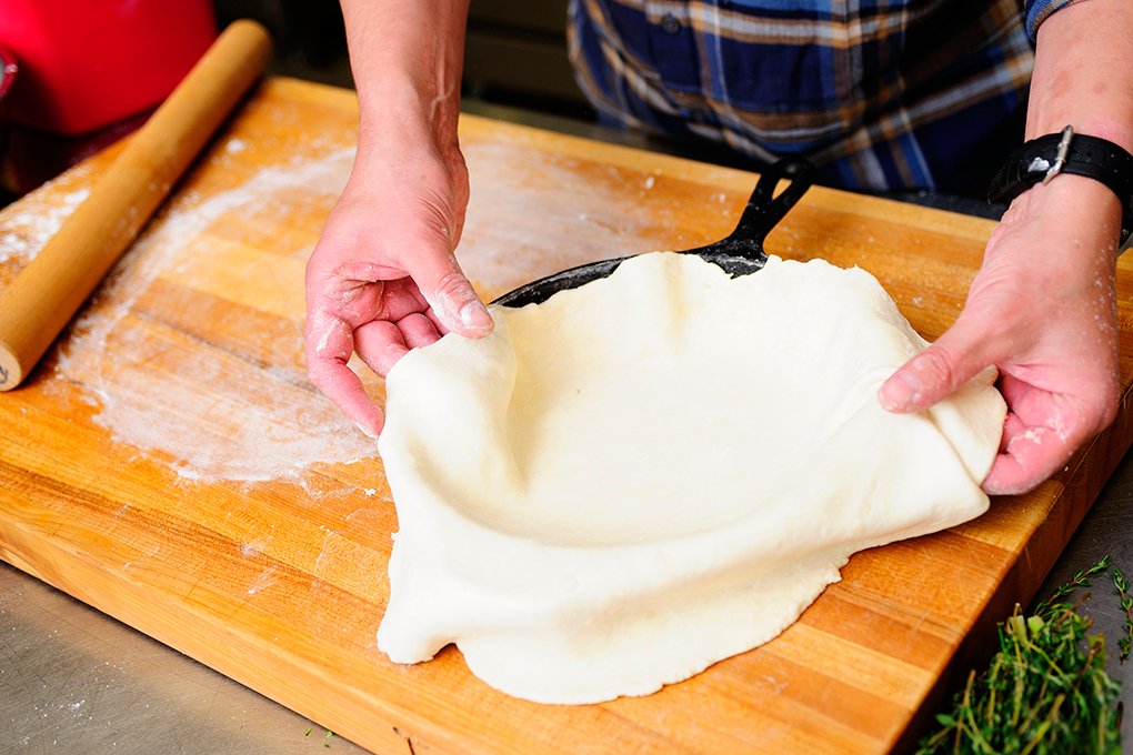 Into a pre-chilled 8 or 9-inch cast iron skillet brush butter, and sprinkle lightly with a little salt. This keeps the piecrust from adversely interacting with the cast-iron.