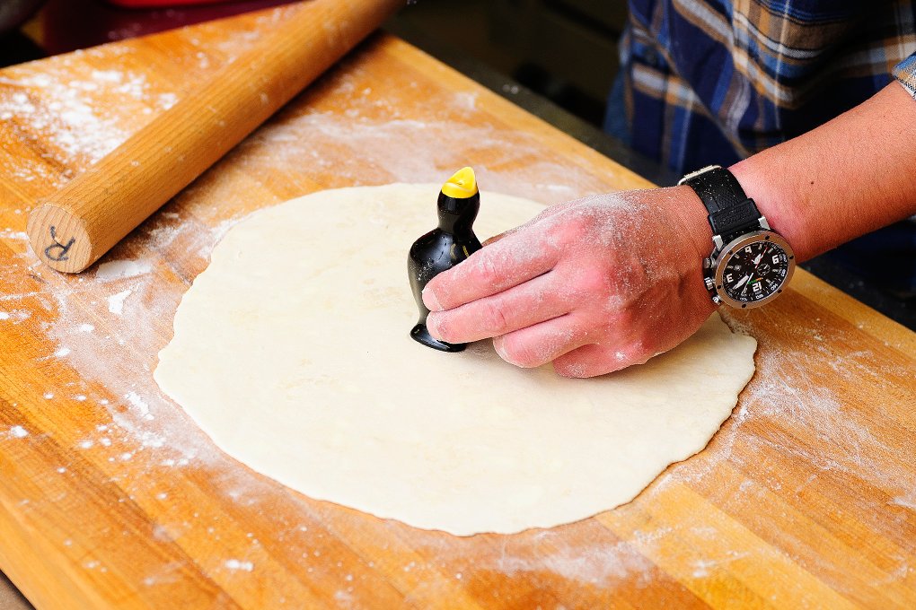 Once your base crust is in the pan let it sit there for 5 minutes to stretch and relax. While the crust is settling into the pan, roll out your second crust. Put an x in the middle to create a small opening for the pie bird, if you have one. This old fashioned pie bird will let out steam as the savory crow pie bakes in the oven.