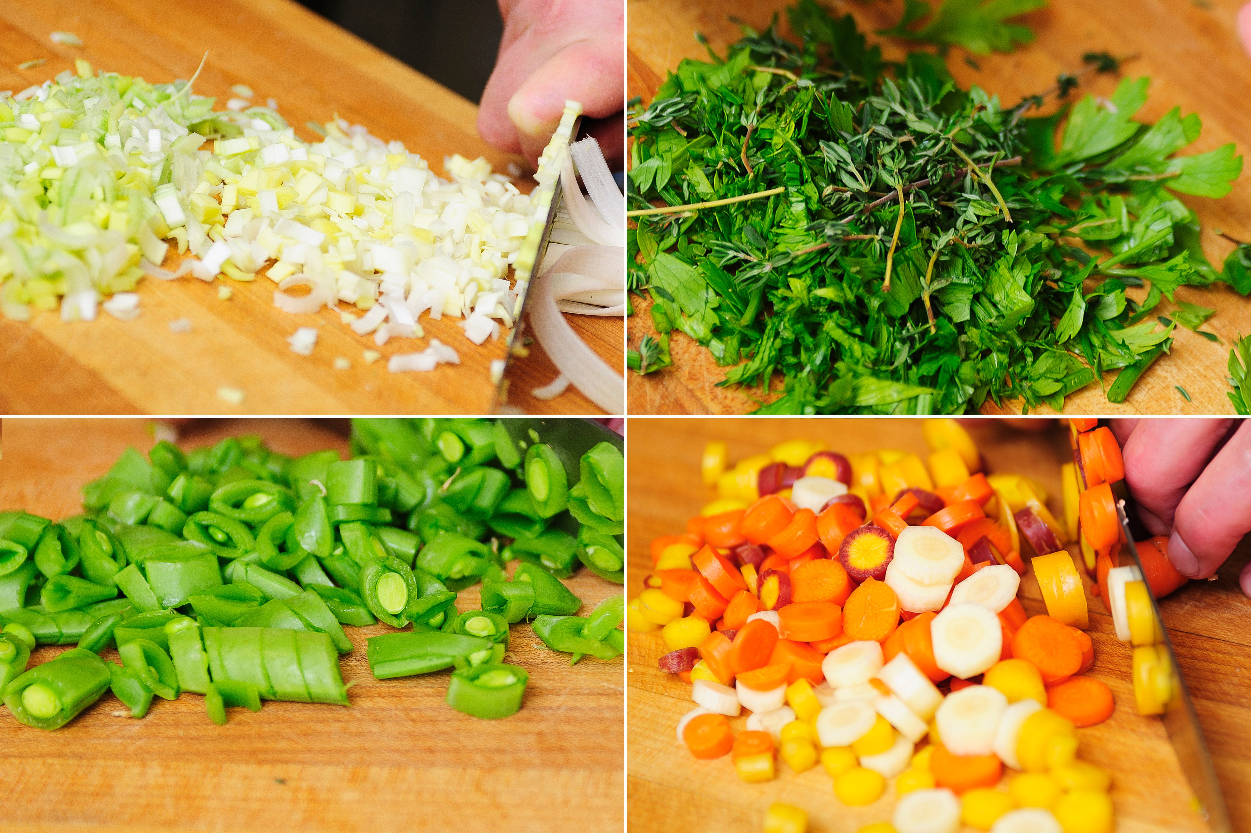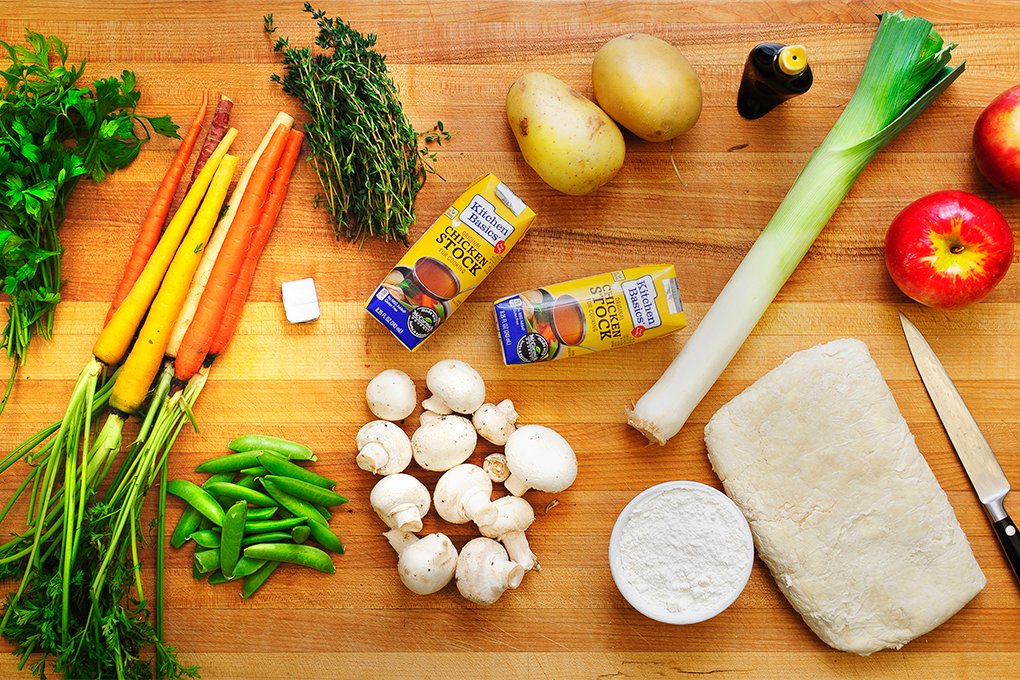 Cut the leek in half lengthwise, then quarters, then eighths, and dice. Slice mushrooms, dice carrots and peas, chop parsley, strip thyme sprigs and rough cut. Dice potatoes, core and dice one apple.