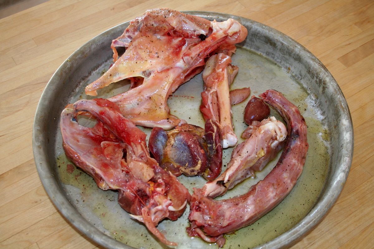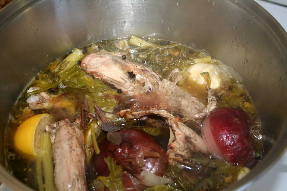 Making it’s very simple: all it requires is that you save the bones of the animals you hunt or the heads and spine section of the fish you catch. Once you have enough bones or fish, you just have to roast them. I usually toss my carcasses with a little olive oil and some salt and pepper, then roast them in the oven at 400 degrees for about 30 minutes. You don’t want to overcook the bones—just put a nice brown color on them. Once the bones are cooked, add them to a stock pot and cover with water. Simmer the bones in the water—be careful not to let the water boil. If it boils, it will release the fat into the water and become difficult to separate. At a very gentle simmer, the fat rises to the top and you can scrape off the fat and scum that floats on top of the water.