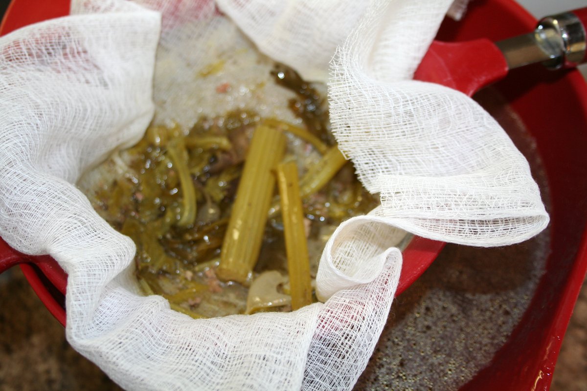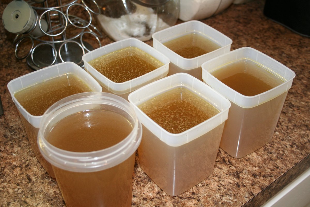 After you add the extra ingredients, continue to simmer for 2 hours. Next, strain the stock through cheese cloth and skim off as much fat as possible. Return the stock to your stock pot and heat on high to reduce the stock and concentrate the flavor. Pour the stock into your containers and place in the fridge until cooled completely. Any fat that is left in the stock should solidify on the top and can be scraped of before final storage.
