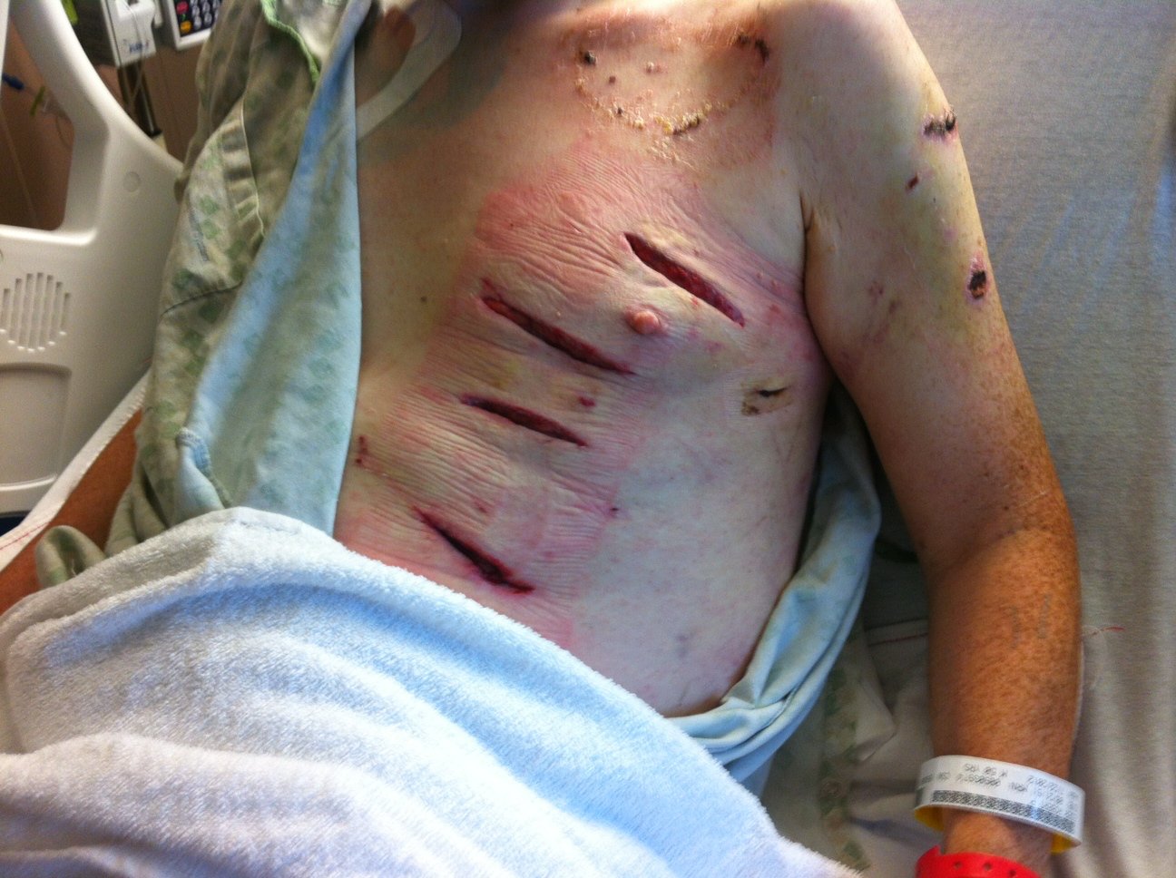 After the bear left, Bob slid down the hill to the trail. He didn’t have cell service and he could put weight on his leg, so he knew he would have to walk out. He took off his shirt and tied it around the wound on his leg, “not as a tourniquet,” he said, but just to hold the wound together as he walked out. He eventually made it down to a private driveway and phone service and was able to direct police officers to his location. He said it was over an hour from the attack to when they found him, but he remembers the entire trip to the hospital. After getting to the hospital, he woke up four days later to find out that they had to give him over 10 units of blood to make up for what he lost, and his body temperature was down to almost 90 degrees.
