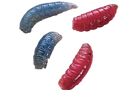 Similar to spikes, Eurolarvae are European blowfly maggots that have been fed dyed food to turn them a variety of colors, including red, blue, orange, yellow, and white. Because of their small size, anglers often gob three or four of them on the hook or jighead.