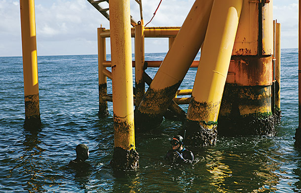 This leaves very little time to identify a target, stalk and shoot it, and fight it to the surface. “You have a reel attached to your gun, so once you shoot, it free-spools line while you swim back to the surface. You want to keep some tension on the fish and fight it as you ascend, otherwise it could wrap around a rig leg or get snagged under rocks. When that happens, you have to put on the scuba gear and go get it, which really sucks!” she says.