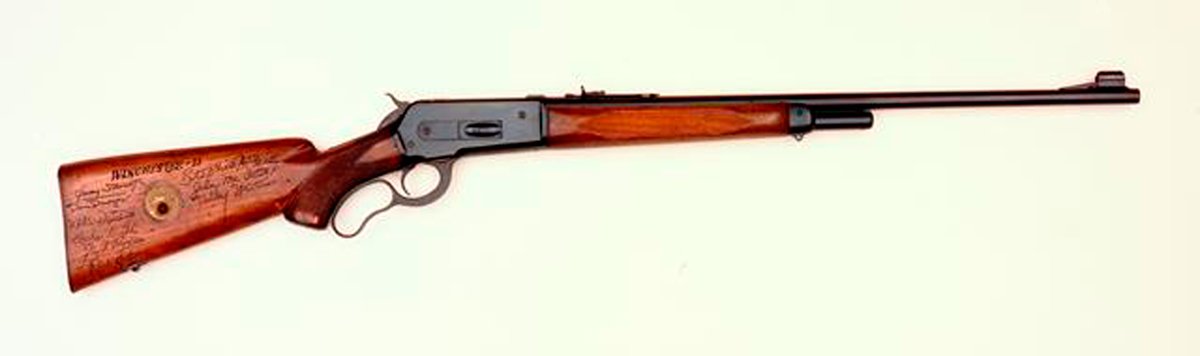 Most notably, the Model 71 was used during the shooting competition scene between Stewart and Steven McNally. In the scene, Stewart stood on wooden Coke cases to achieve the desired camera effects, while Parsons stood beside him with the Model 71. Stewart wins the competition by shooting through a disc. Parsons impressed the crew so much with his talent and expertise that the cast signed the stock of the firearm and embedded one of those discs into the wood.