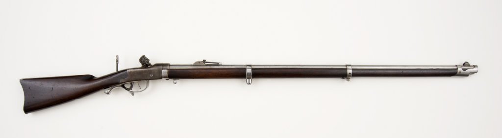 This breechloading percussion rifle is a one-of-a-kind piece that Berdan made in honor of President Abraham Lincoln. President Lincoln had a well-known interest in new firearms technology and was also an ardent supporter of Berdan. He along with General Winfield Scott supported Berdan’s recruitment of 18 sharpshooter companies during the War.