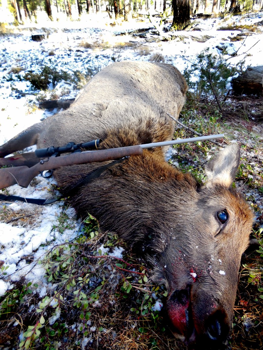 With the larch as a marker, I crawled behind one rock to the next into sure range. At the shot the elk’s long neck turned rubber and she slumped over in her bed. A scattering of more elk stood from their beds back in the trees and bunched up. They ran up the mountain when they saw me approaching.