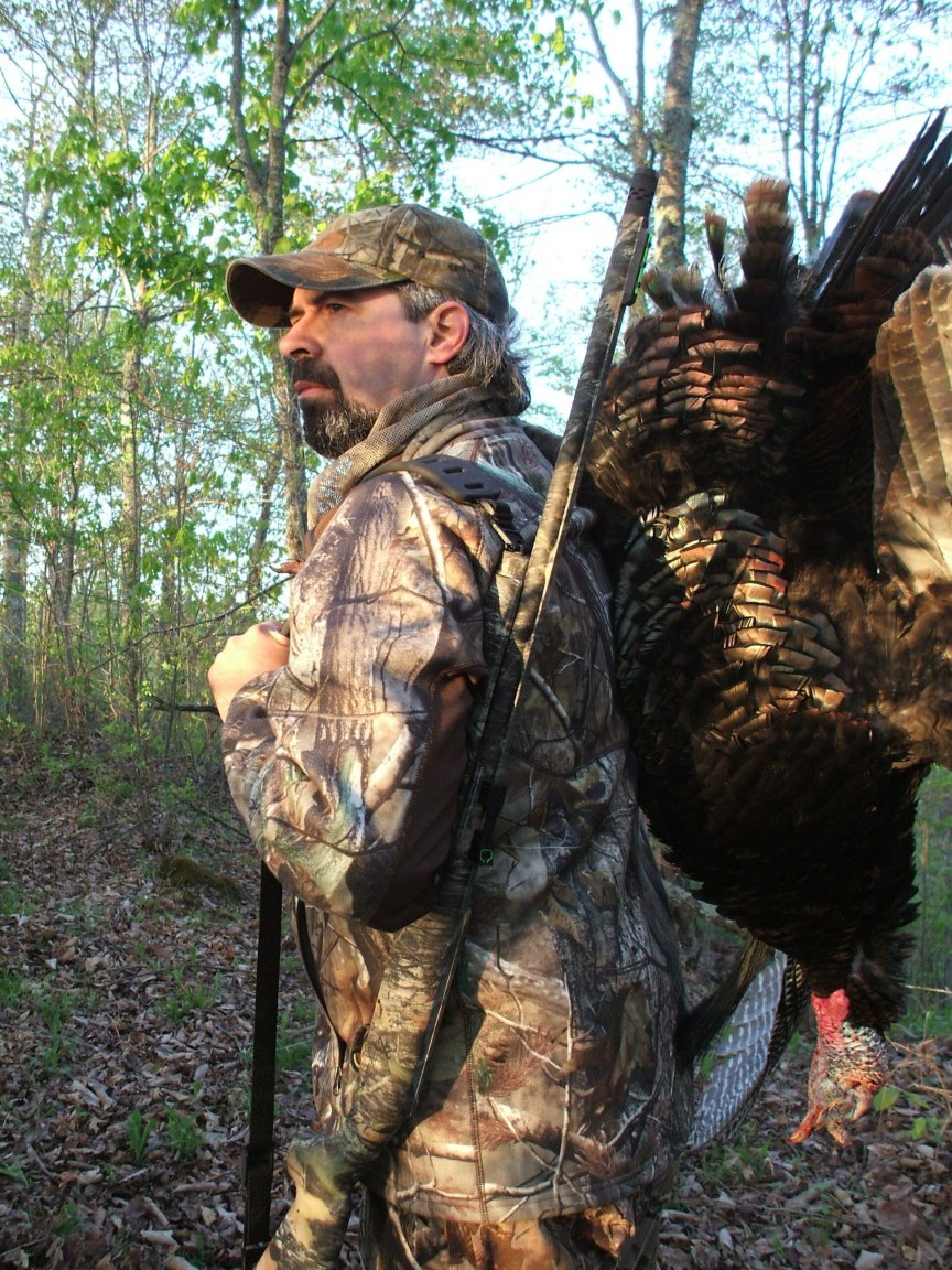 We set up. Two gobblers sounded off. I could hear one strutting on his limb below; the drumming was distinct in the windless air. Josh softly called. They barked back. Down they flew (heard, not seen) roughly 80 yards away on the side hill. The strutter appeared not long after, and moved away at an angle. Hidden by cover, I scratched some leaves as Josh yelped. The bird wheeled to face us, and began his way to us. Another longbeard, not strutting, followed. Up the hill both came. Both walked the little spine on top of the ridge. After the strutter passed a broad tree trunk, I let him have it at 14 yards.