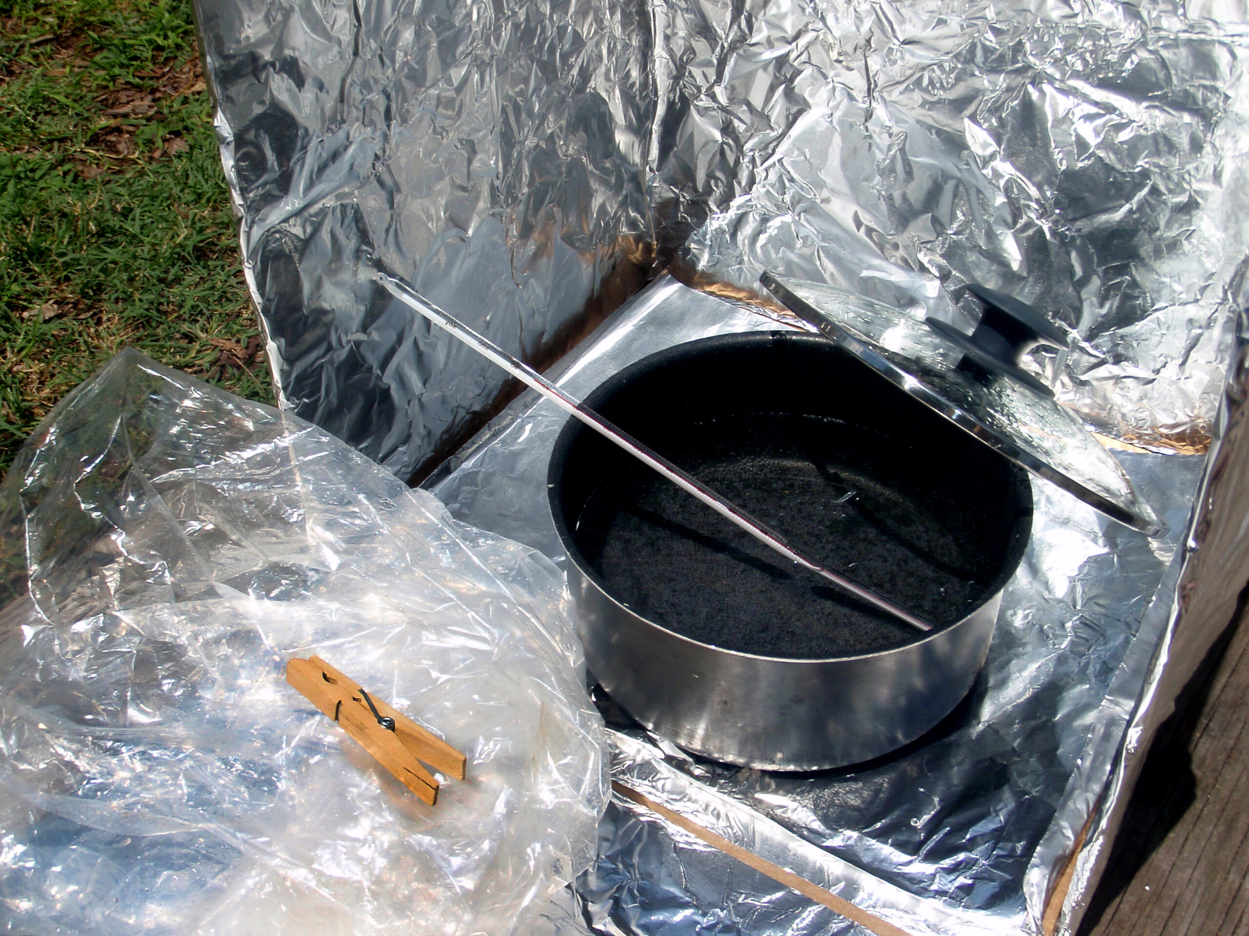 To build it, I left the top open on my cardboard box and cut one side wall so that it could drop down. Next, I taped aluminum foil on the interior of the entire cardboard box. This whole box cutting and foil wrapping part took about 10 minutes. I then placed the black pot containing one quart of water inside the turkey bag, closing the bag with the clothespin and aiming the box’s opening toward the sun. Our test day was sunny with an air temp of 70 Fahrenheit at the beginning of the test at 10:00 am. The water in the pot had a temp of 60 F right out of the tap. I waited 30 minutes and opened the bag, finding the air inside hot. It was a shock to dip my finger in the water and find it at bath-water temperate in just half an hour. The thermometer confirmed that the water had reached 104 F, a jump in temperature of more than 40 degrees in just 30 minutes. I was eager to see what happened next.