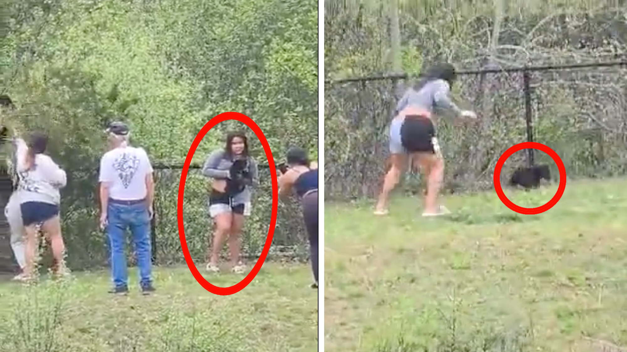 “Oh my god, did she just drop it?” the women filming behind the camera ask, incredulous. The bear cub sprints away from the crowd along the fenceline. It stops multiple times and reaches up, trying to find a way back over the fence to the other side but it is unsuccessful. In the final seconds of the video, the teenthat had been holding the bear cub runs up behind it and corners it against the fence, trying to grab it again.