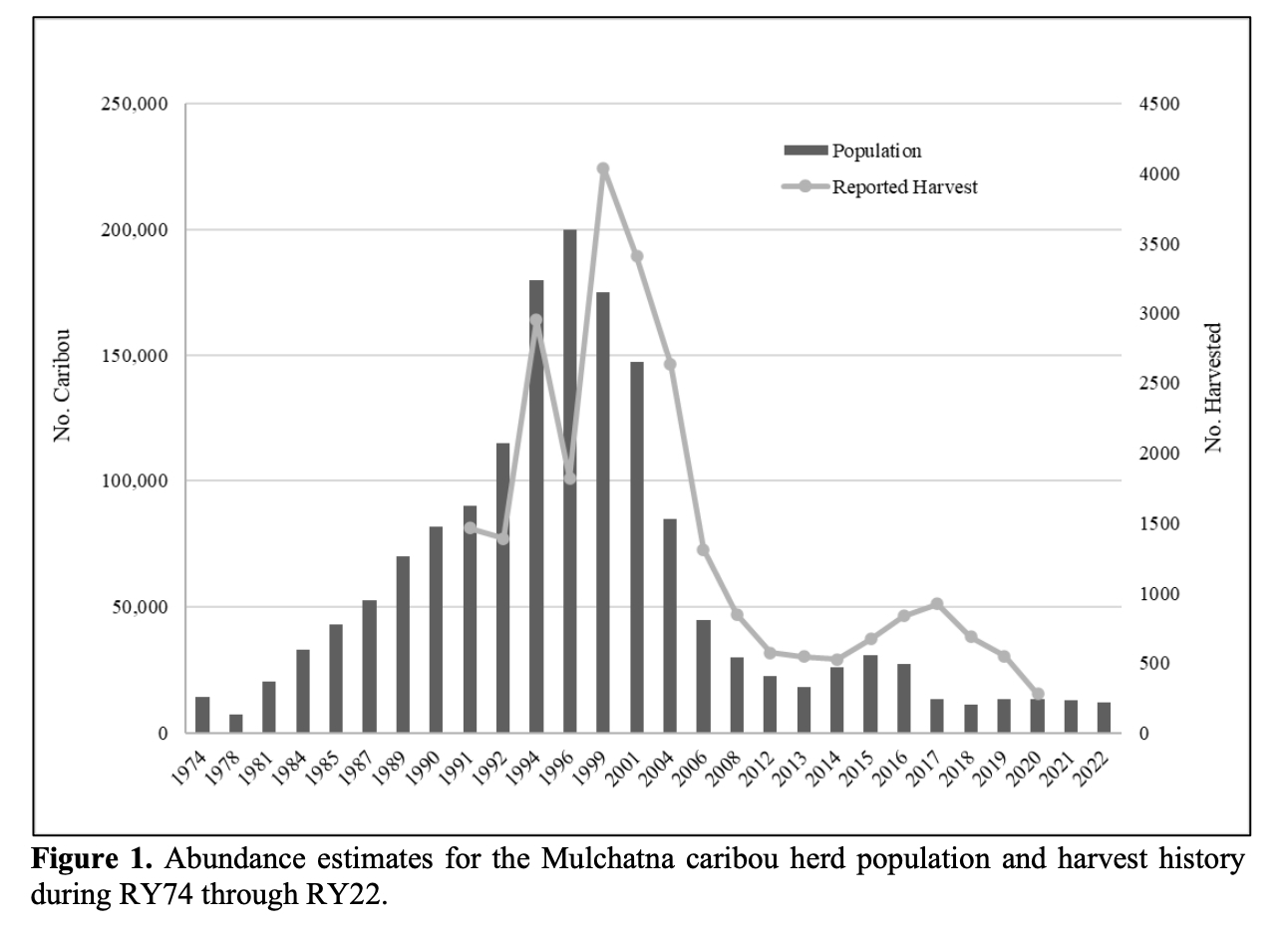 The Mulchatna herd peaked in 1997 at 200,000 animals and has since declined to a little more than 13,000 animals in 2019, where it generally remains. This is well short of the state’s management objective of 30,000 to 80,0000 caribou for the herd, which it views as necessary to sustain a huntable population. Many stakeholders remain concerned that poaching could be contributing to the low population. Hunter harvest by Native, resident, and non-resident hunters topped out in 1999 at a reported take of 4,770, but that figure sharply declined thereafter and generally followed herd population trends.