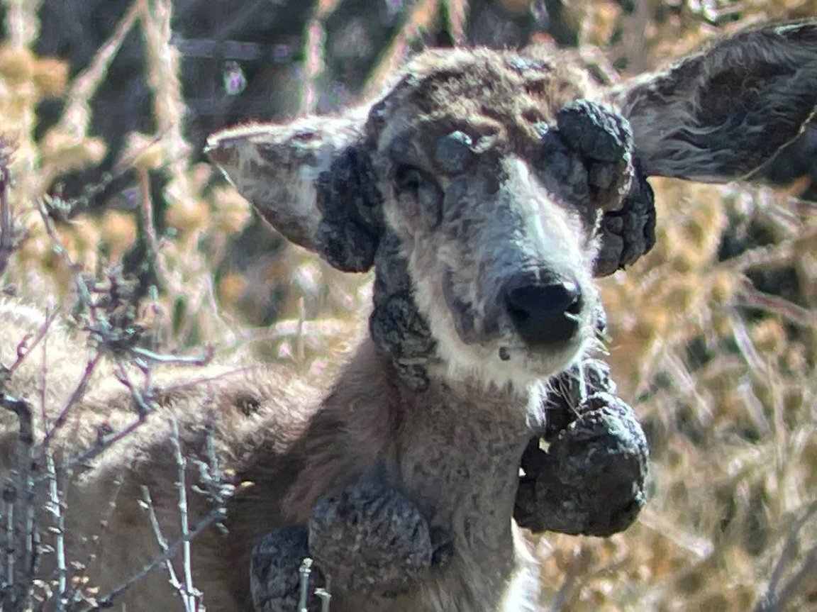 While this mule deer is experiencing a particularly drastic case of cutaneous fibromas (a technical term that translates to “benign skin tumors”) the wart-like lumps aren’t typically a threat to a deer’s health. The growths are caused by a virus, and while they’re “unsightly,” says CPW, most fibromas will eventually subside and heal completely. Once it recovers, the deer’s immune system should be resistant to any future infections from the virus.