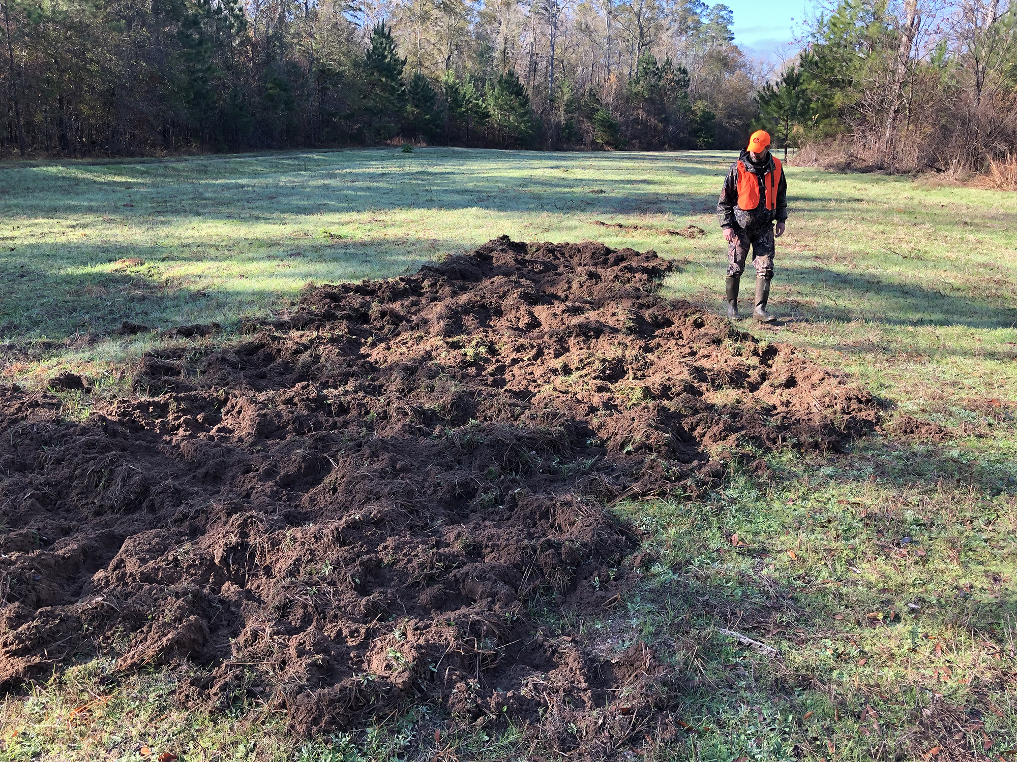 Rooting is the classic sign that hogs have arrived. Oftentimes, it appears as if someone used a tiller to churn up the ground. Hogs do this in search of food, and it can leave wakes of destruction over large areas.